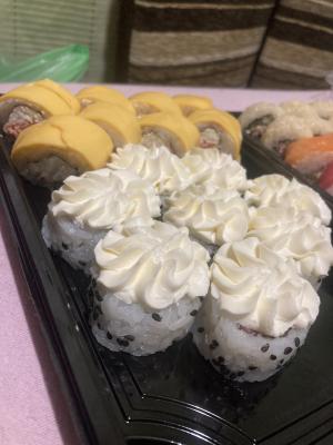 - ролл "Мидии терияки под сырной шапочкой": мидии, морковь терияки, кунжут, крем-сыр, соус терияки, нори, рис - 8 шт.