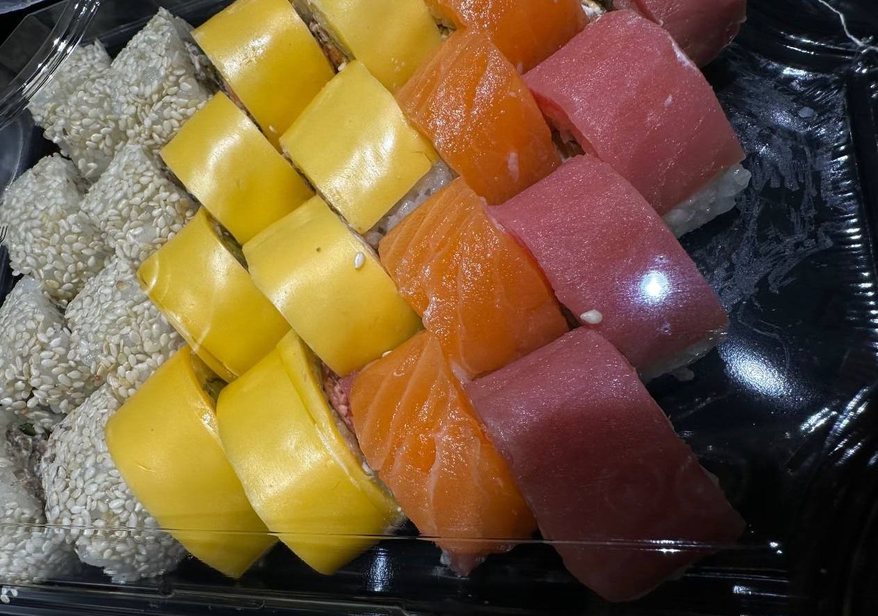 Состав: филе лосося, угорь, креветка тигровая, авокадо, огурец, сыр, рис, нори