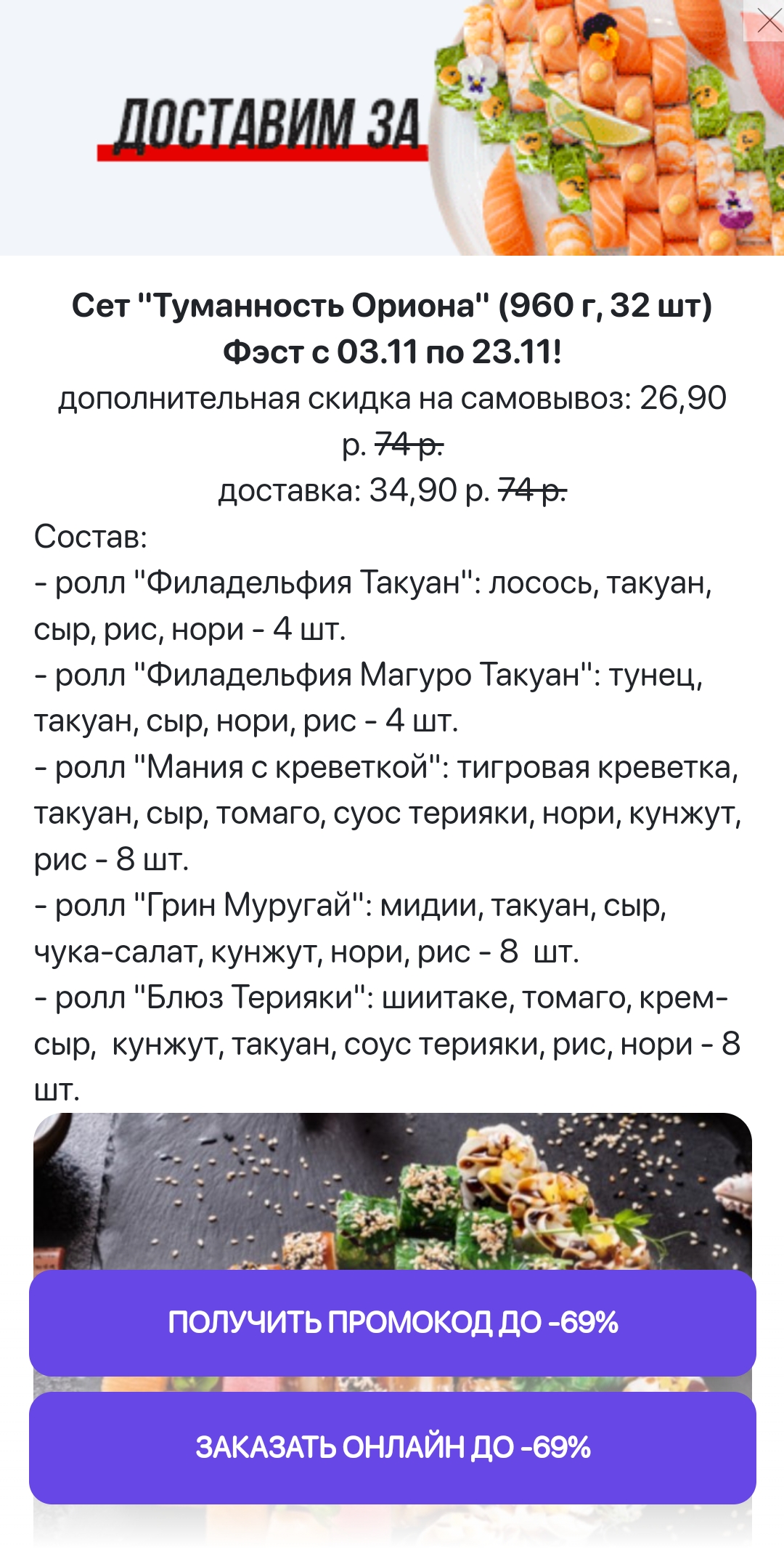- Промокод дает право на скидку до 61% на суши-сеты от "ArtSushi"