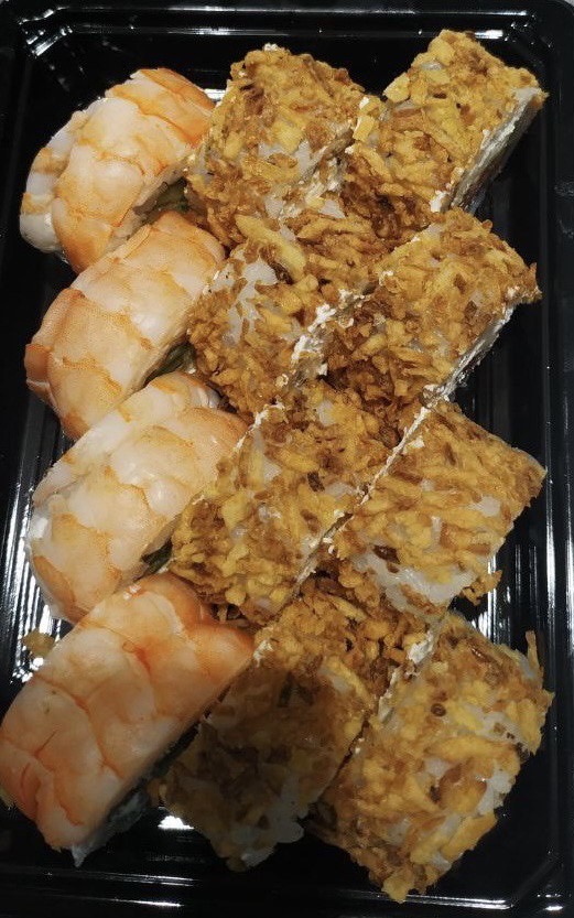 Состав: тунец, такуан, сыр, нори, рис, темпура