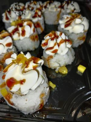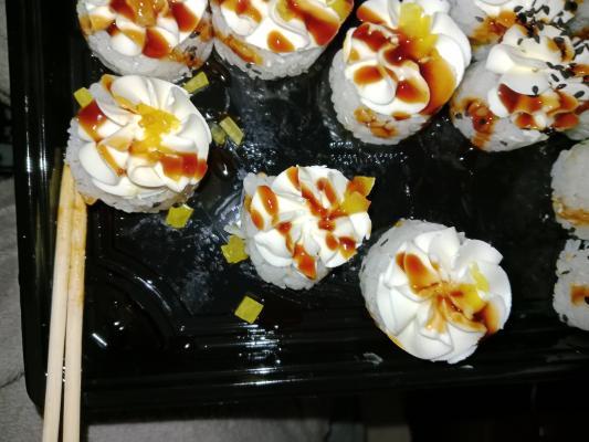- ролл "Мидии терияки под сырной шапочкой": мидии, морковь терияки, кунжут, крем-сыр, соус терияки, нори, рис - 8 шт.