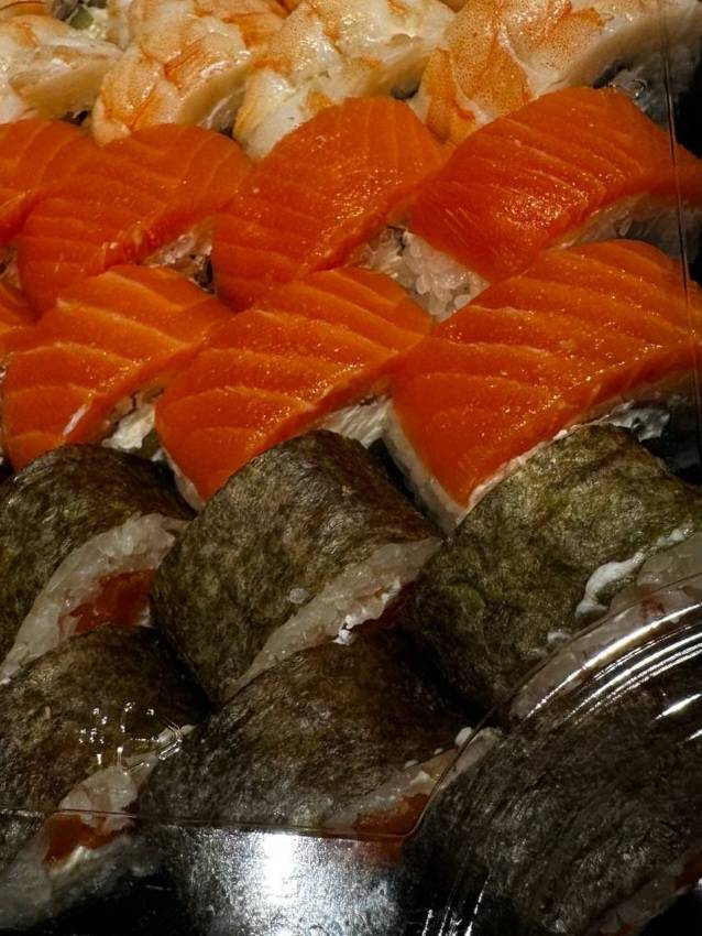 Состав: филе лосося, угорь, креветка тигровая, авокадо, огурец, сыр, рис, нори