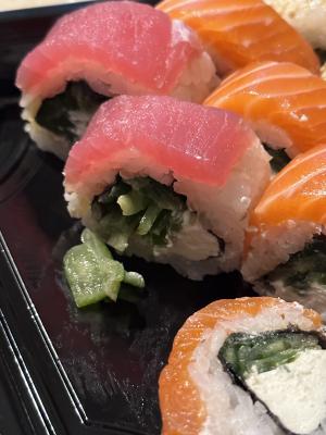 Состав: тунец, такуан, сыр, нори, рис, темпура