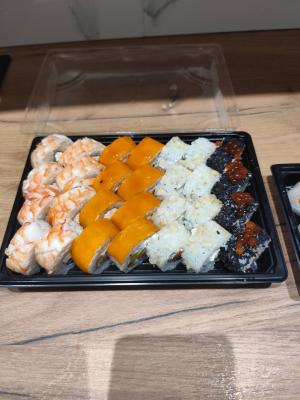 Состав: филе лосося, угорь, креветка тигровая, авокадо, огурец, сыр, рис, нори