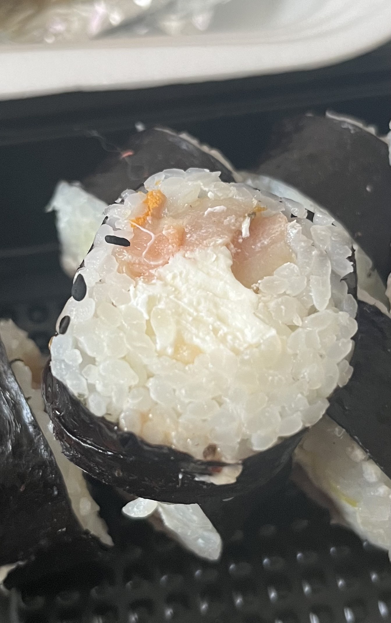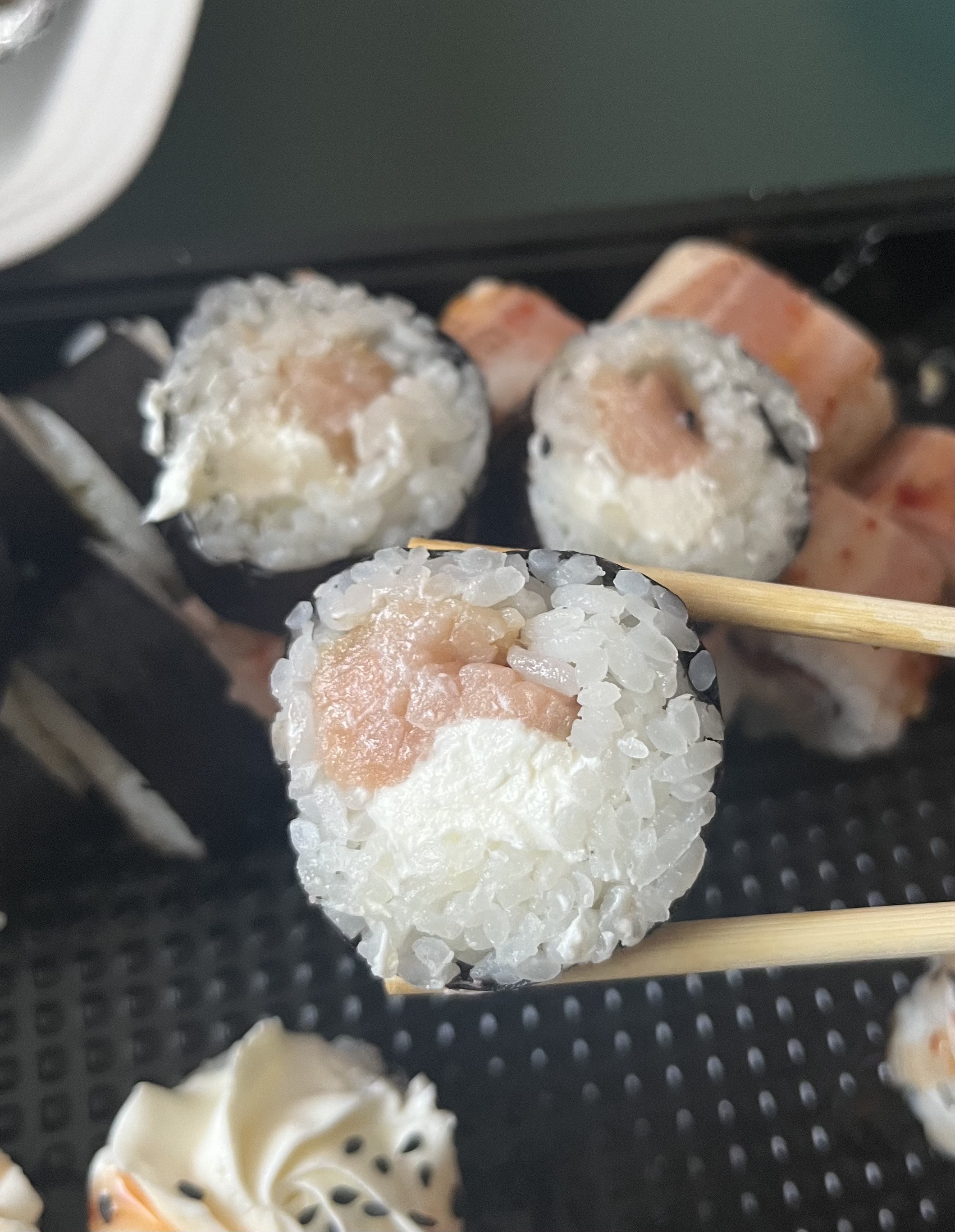 Состав: тунец, такуан, сыр, нори, рис, темпура