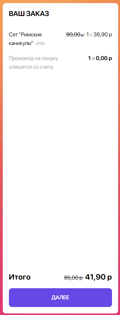 - Один промокод - один заказ без ограничений по количеству сетов со скидкой.
