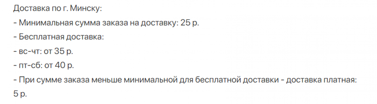 - Минимальная сумма заказа на доставку 31 декабря - 60 р. Менее 75 р. в заказе - доставка 5 р. Бесплатная доставка по г. Минску при стоимости заказа от 75 р.