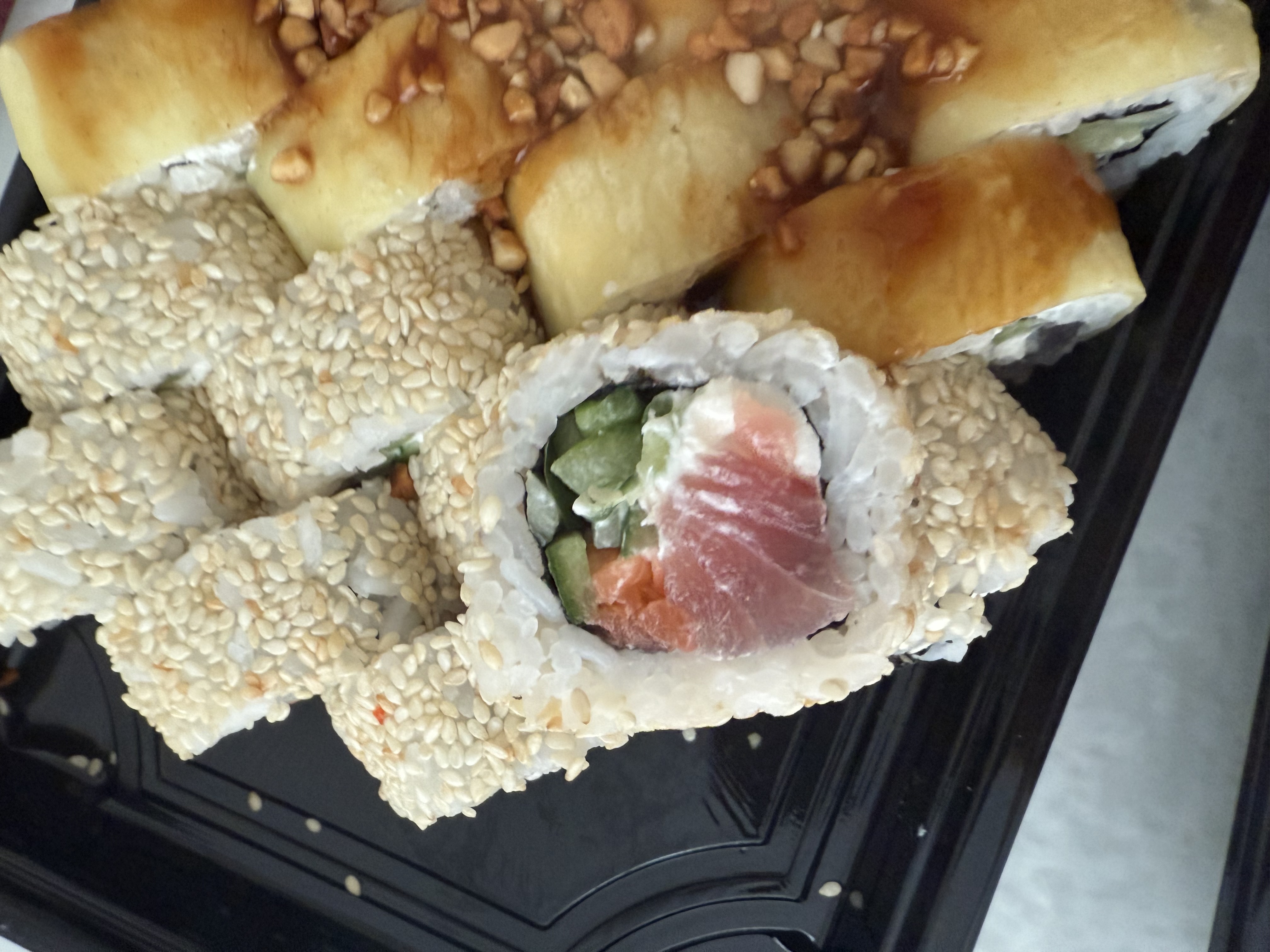 Состав: филе угря, авокадо, огурец, сыр, рис, соус терияки, кунжут