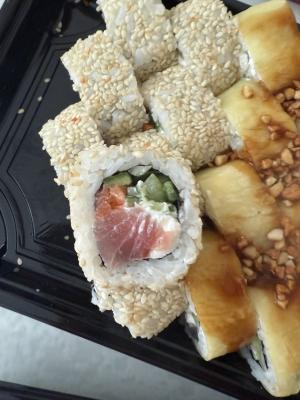 Состав: филе лосося, угорь, креветка тигровая, авокадо, огурец, сыр, рис, нори