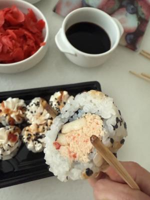 - ролл "Крем-шитаке в японском блинчике": грибы шиитаке, обжаренные в соусе терияки, крем-чиз, японский блинчик оранж, такуан, соус терияки, арахис, нори, рис - 8 шт.