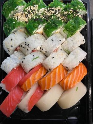 Состав: филе лосося, угорь, креветка тигровая, авокадо, огурец, сыр, рис, нори