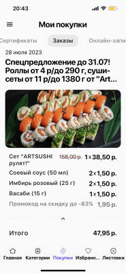 - Промокод дает право на скидку до 67% на суши-сеты от "ArtSushi"