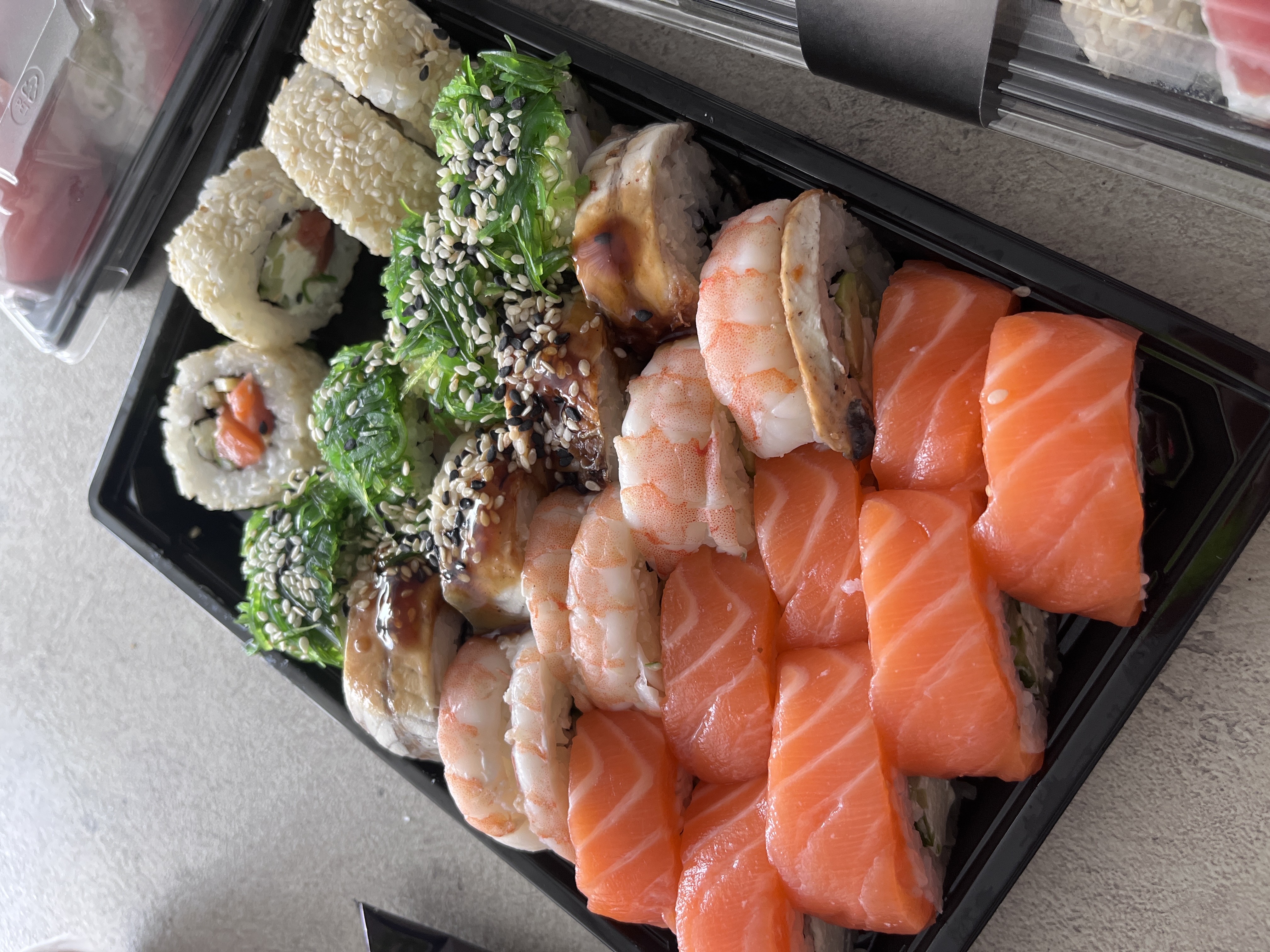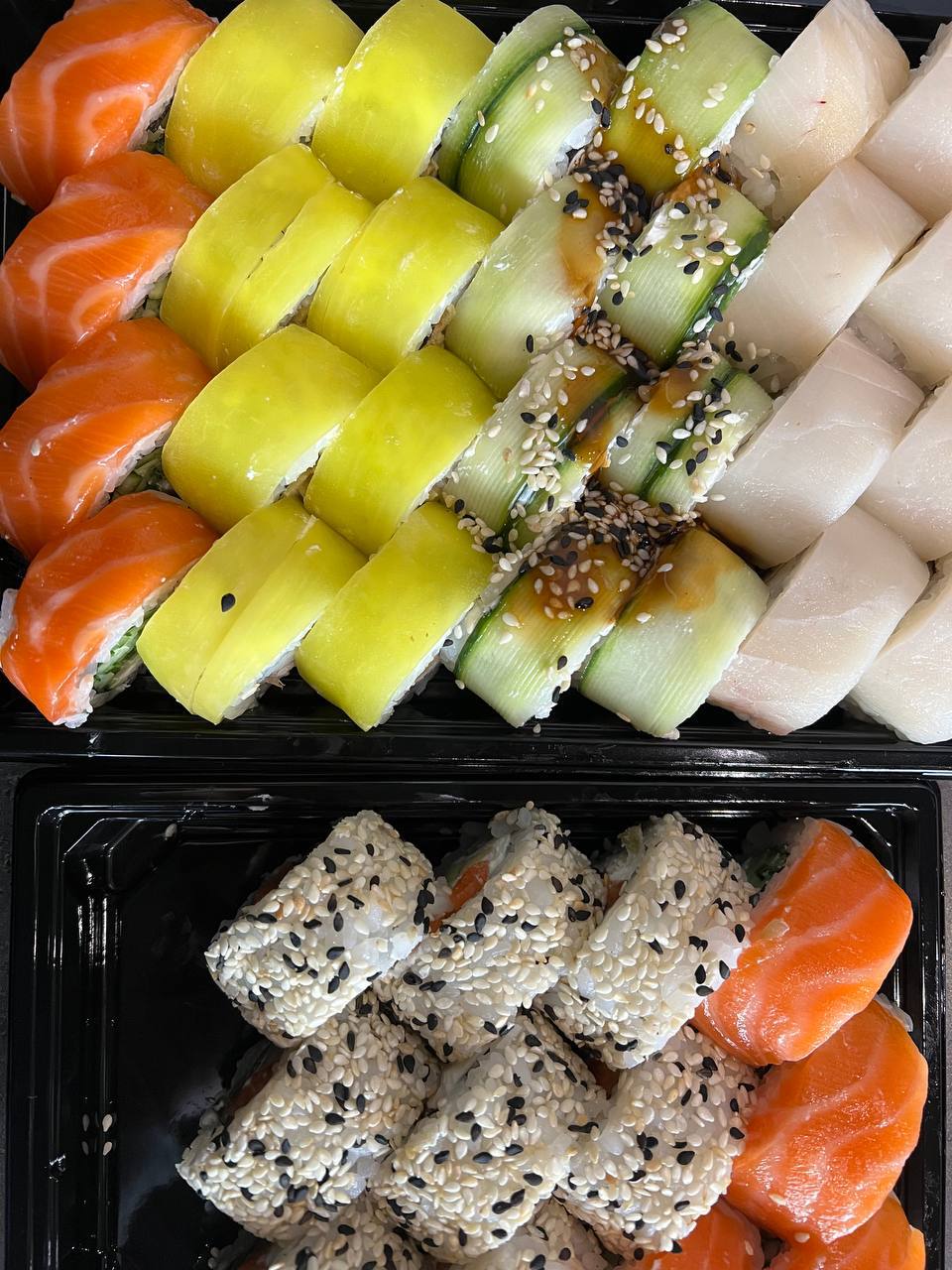 Состав: филе лосося, угорь, креветка тигровая, авокадо, огурец, сыр, рис, нори
