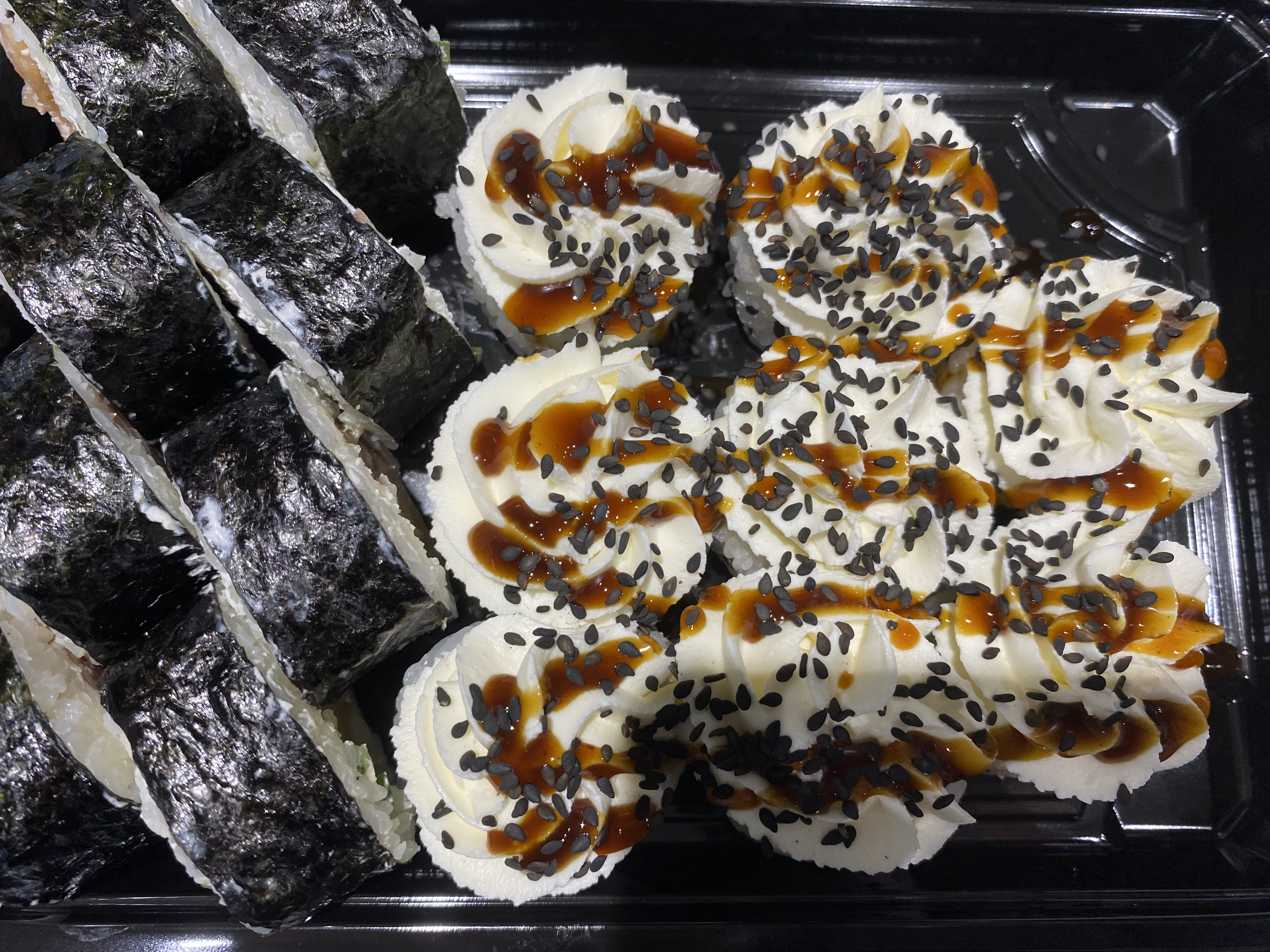 Состав: филе угря, авокадо, огурец, сыр, рис, соус терияки, кунжут