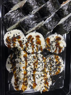 - ролл "Мидии терияки под сырной шапочкой": мидии, морковь терияки, кунжут, крем-сыр, соус терияки, нори, рис - 8 шт.