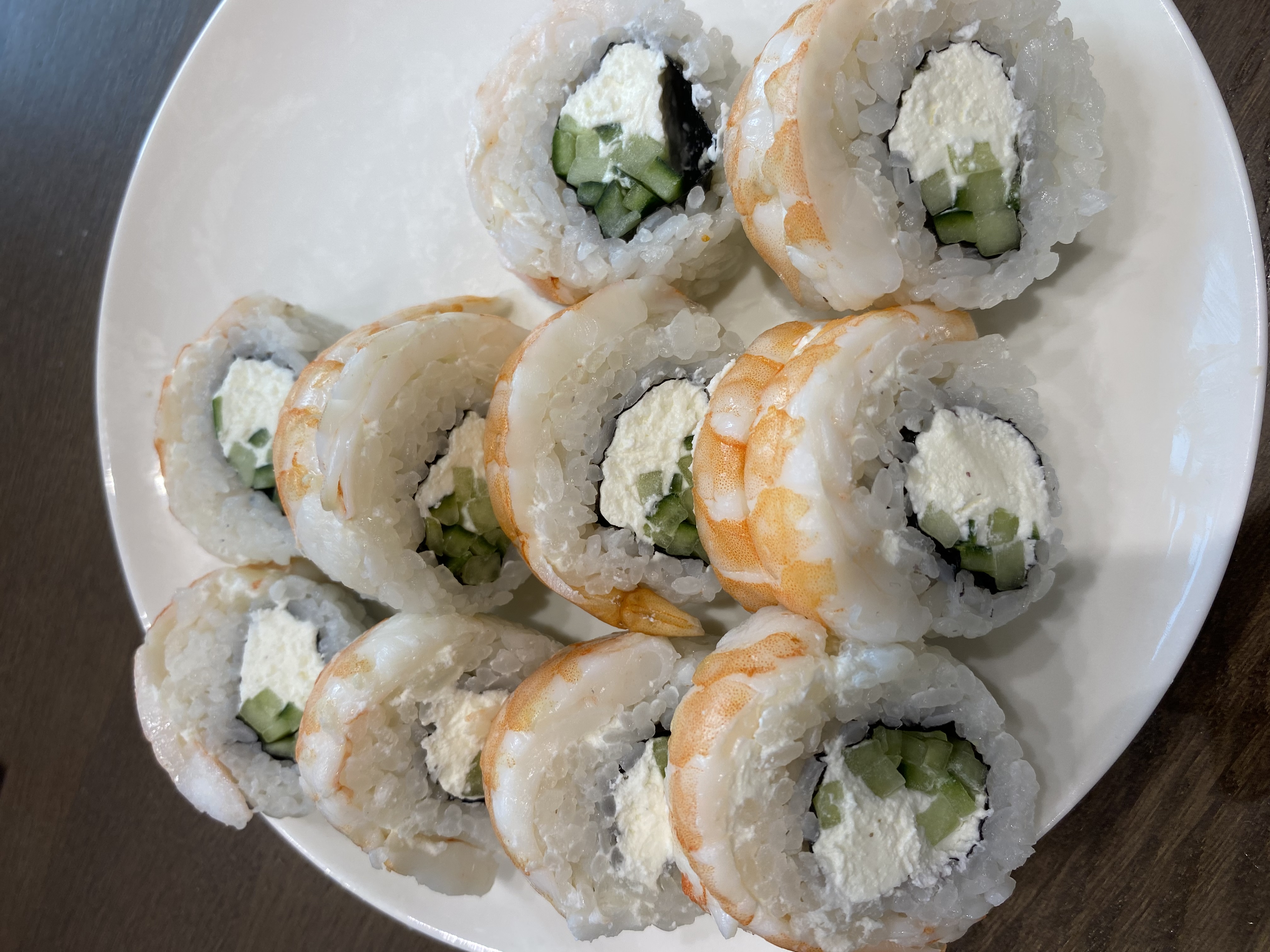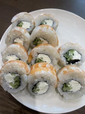 Состав: тигровая креветка, авокадо, огурец, сыр, рис, нори