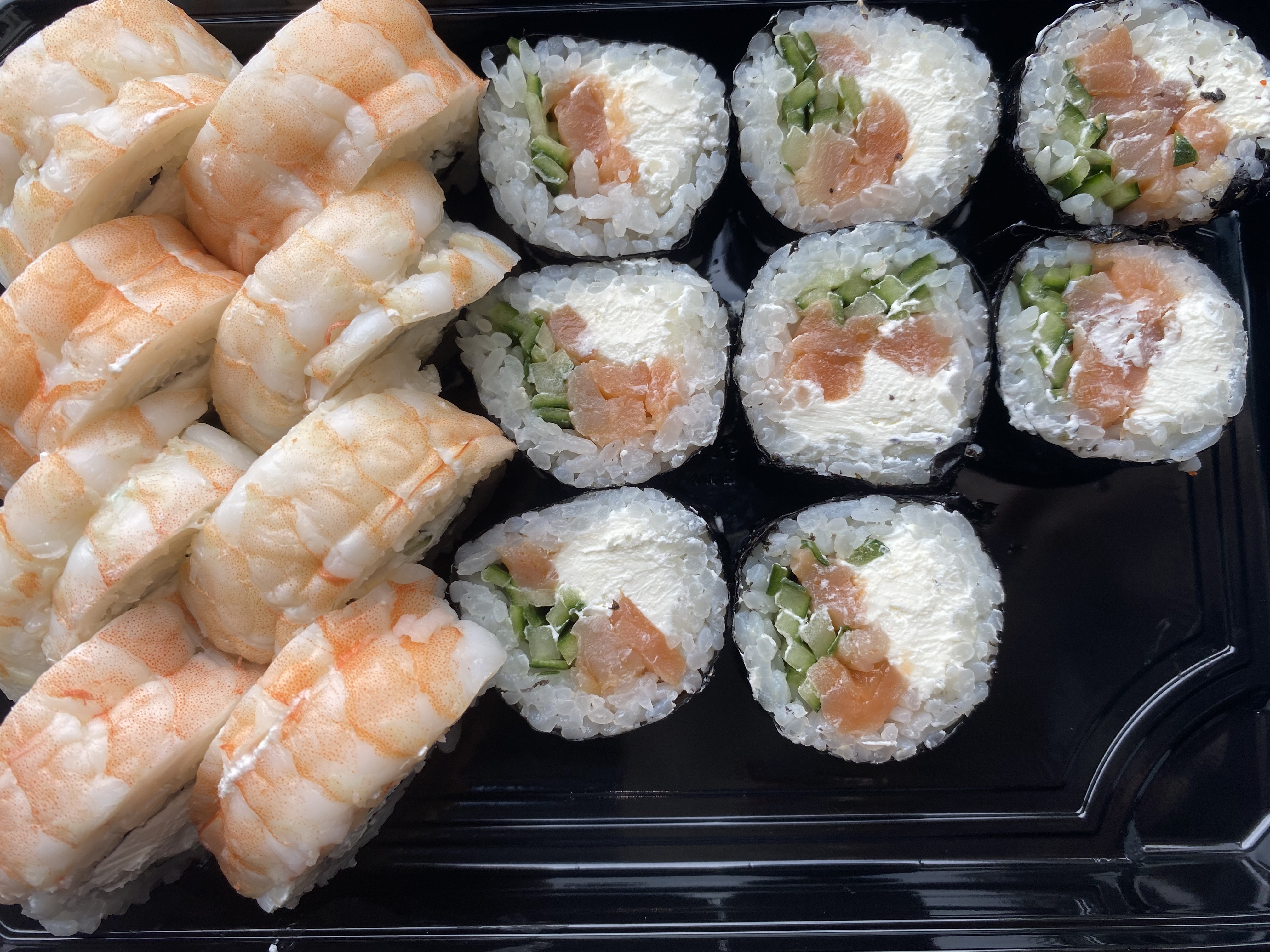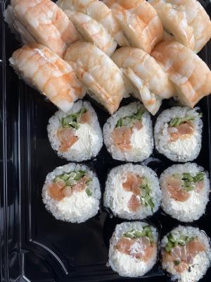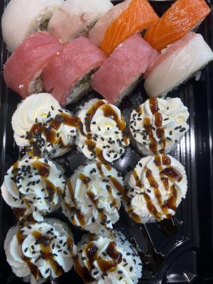 Состав: филе лосося, угорь, креветка тигровая, авокадо, огурец, сыр, рис, нори