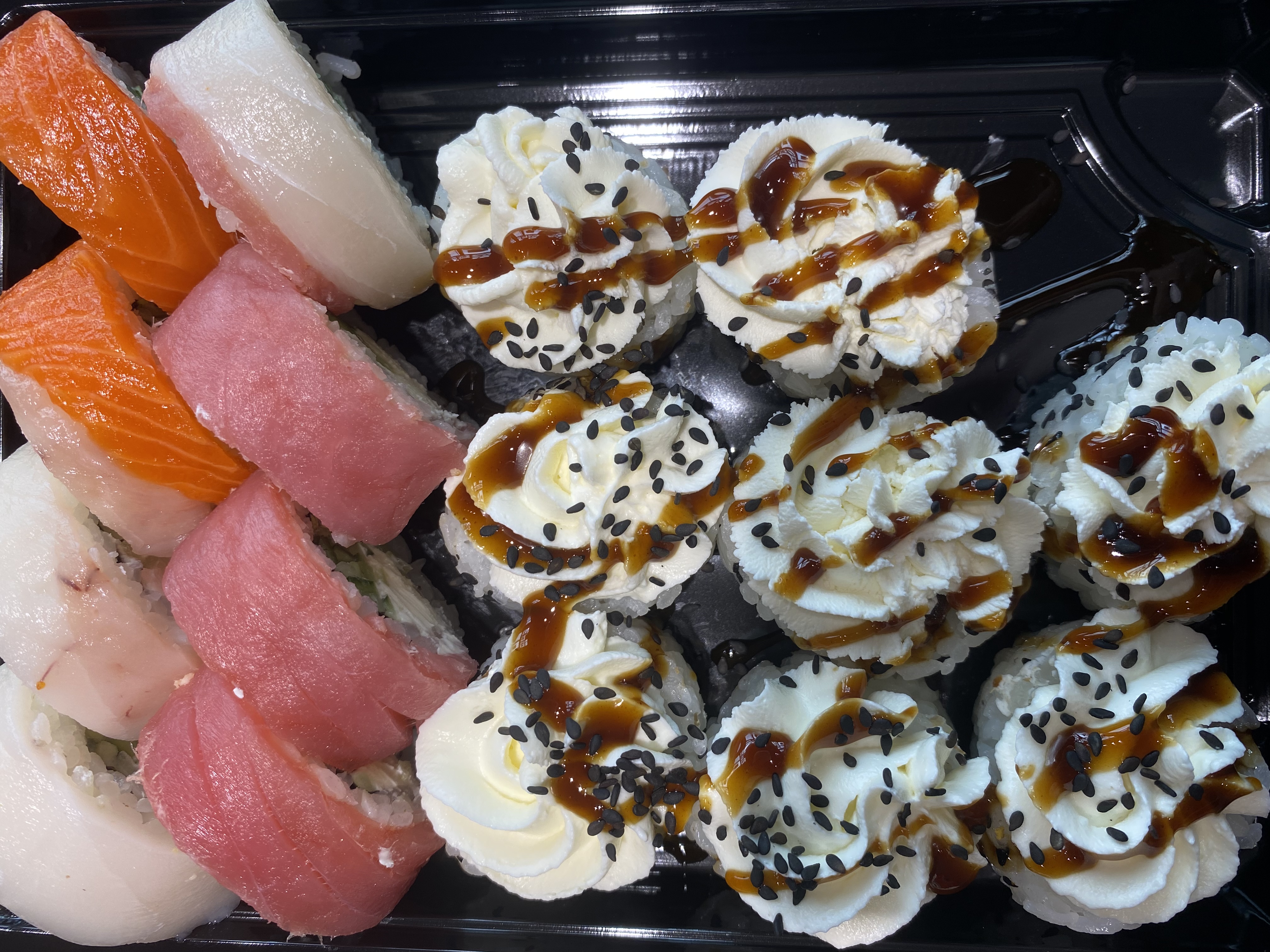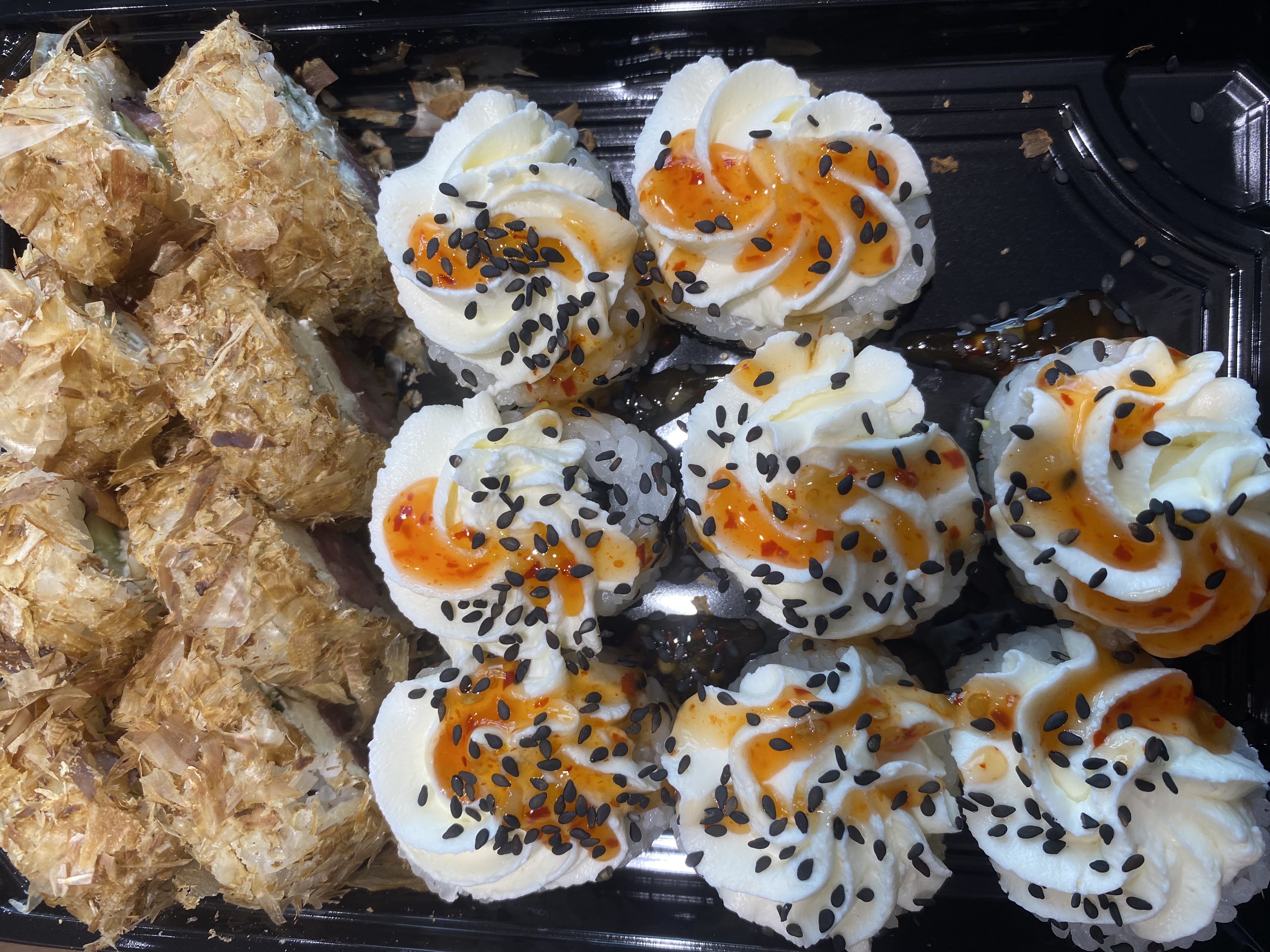Состав: тунец, такуан, сыр, нори, рис, темпура