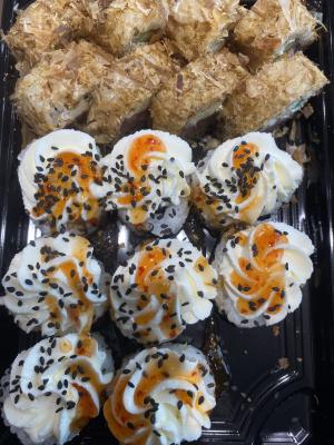 - ролл "Крем-шитаке в японском блинчике": грибы шиитаке, обжаренные в соусе терияки, крем-чиз, японский блинчик оранж, такуан, соус терияки, арахис, нори, рис - 8 шт.