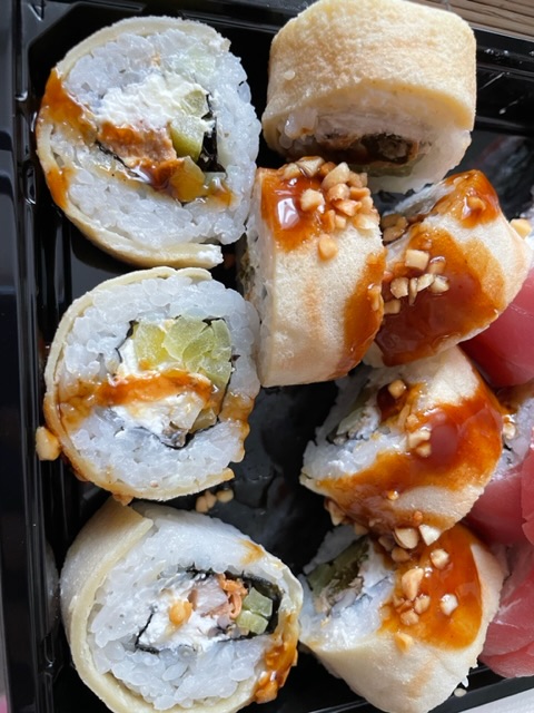 - ролл "Крем-шитаке в японском блинчике": грибы шиитаке, обжаренные в соусе терияки, крем-чиз, японский блинчик оранж, такуан, соус терияки, арахис, нори, рис - 8 шт.