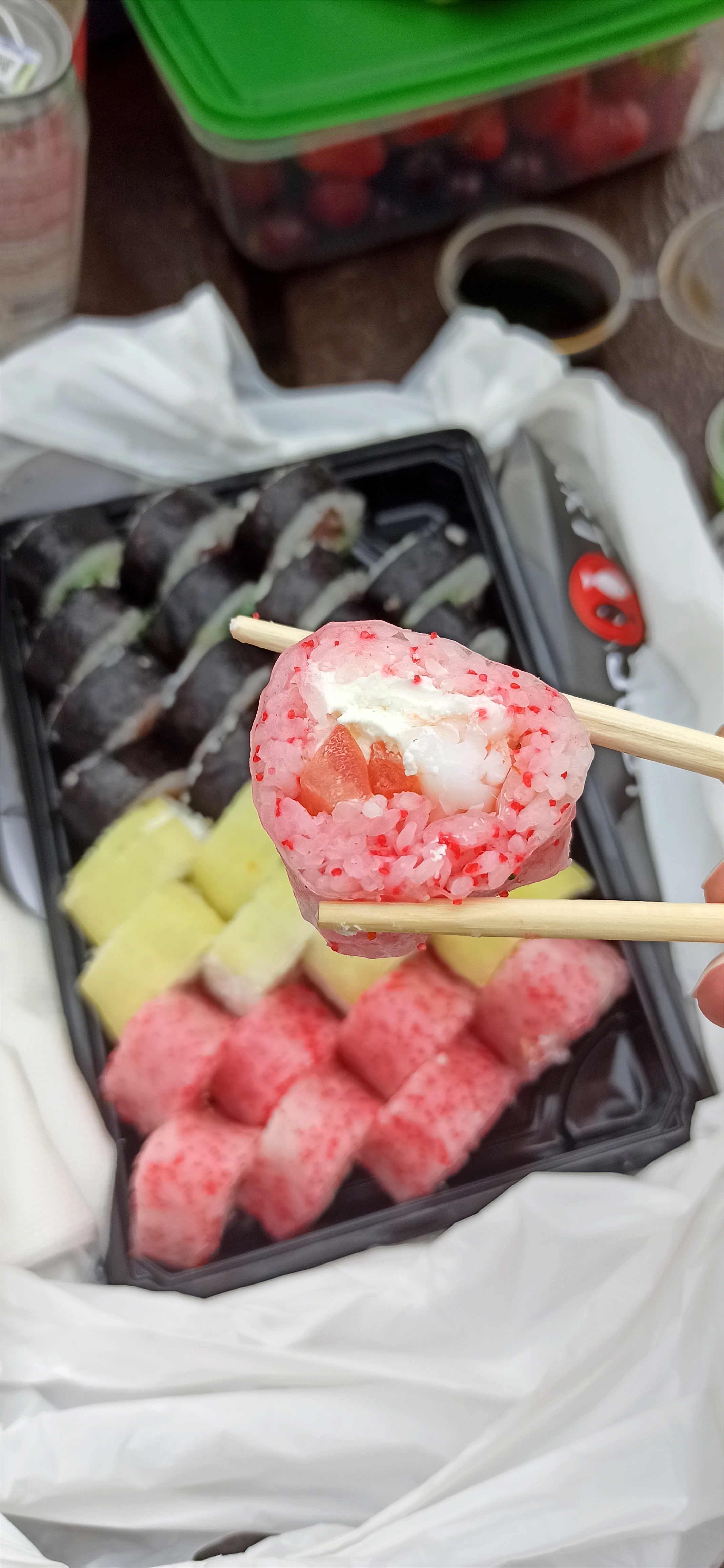 - гарнир: имбирь (25 г), соевый соус (40 мл), васаби (15 г) в подарок!