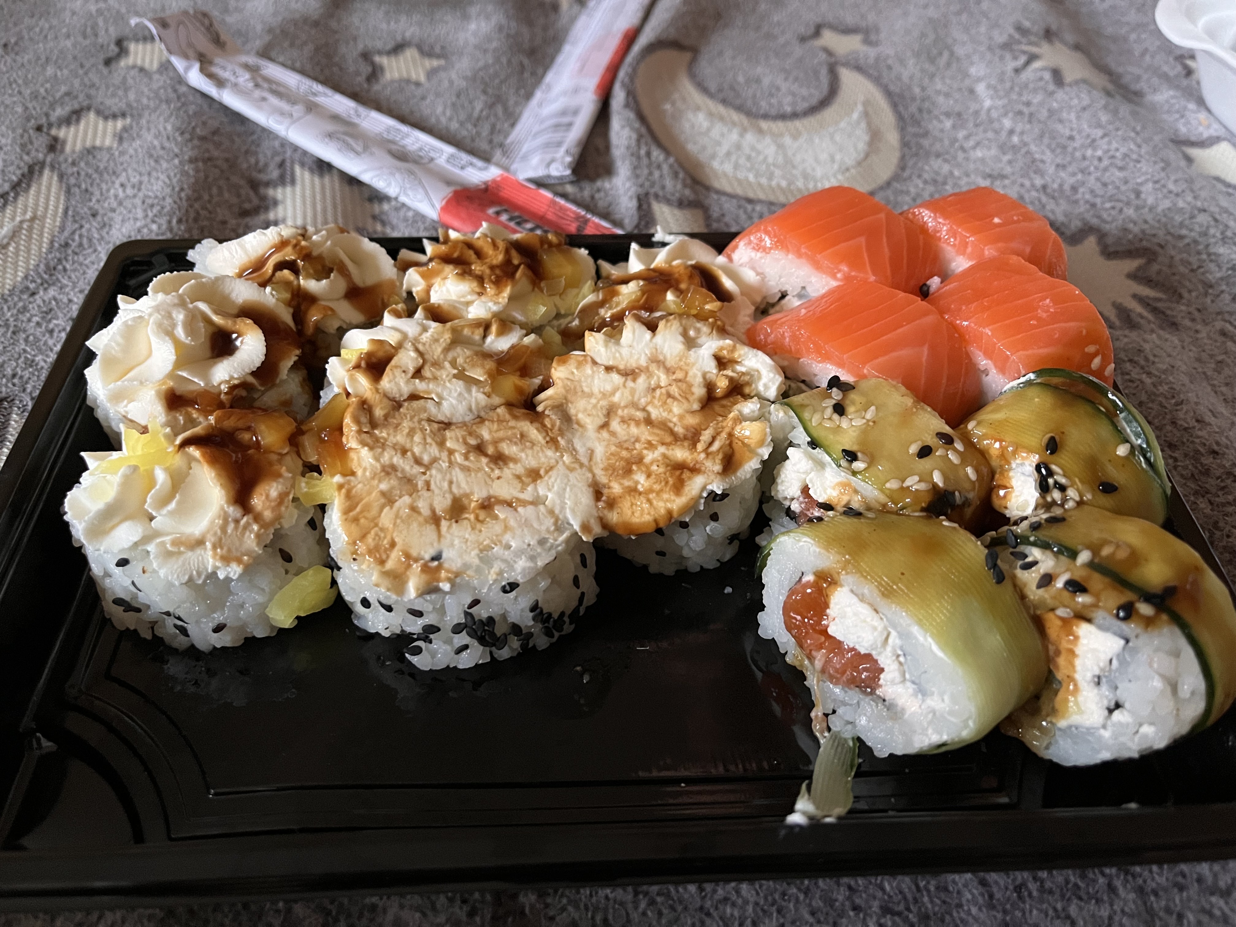 Состав: филе лосося, угорь, креветка тигровая, авокадо, огурец, сыр, рис, нори