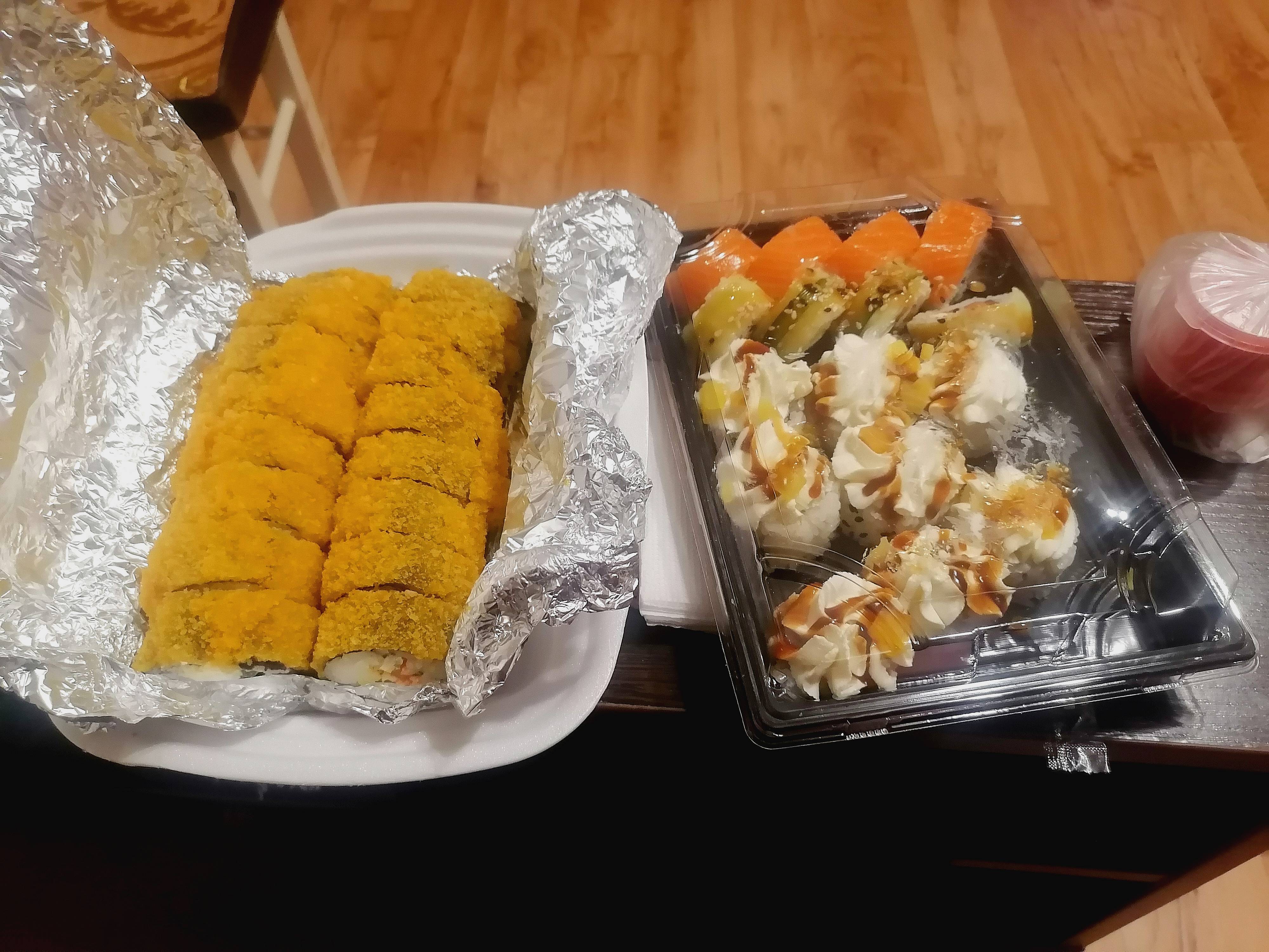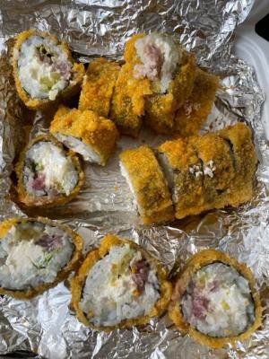 Состав: тунец, такуан, сыр, нори, рис, темпура