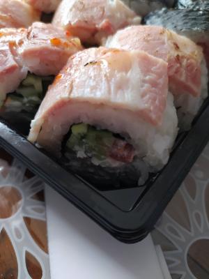 - ролл "В опаленном беконе со спаржей терияки": бекон опаленный, спаржа, обжаренная с соусом терияки, сыр, соус терияки, кунжут, нори, рис - 8 шт.