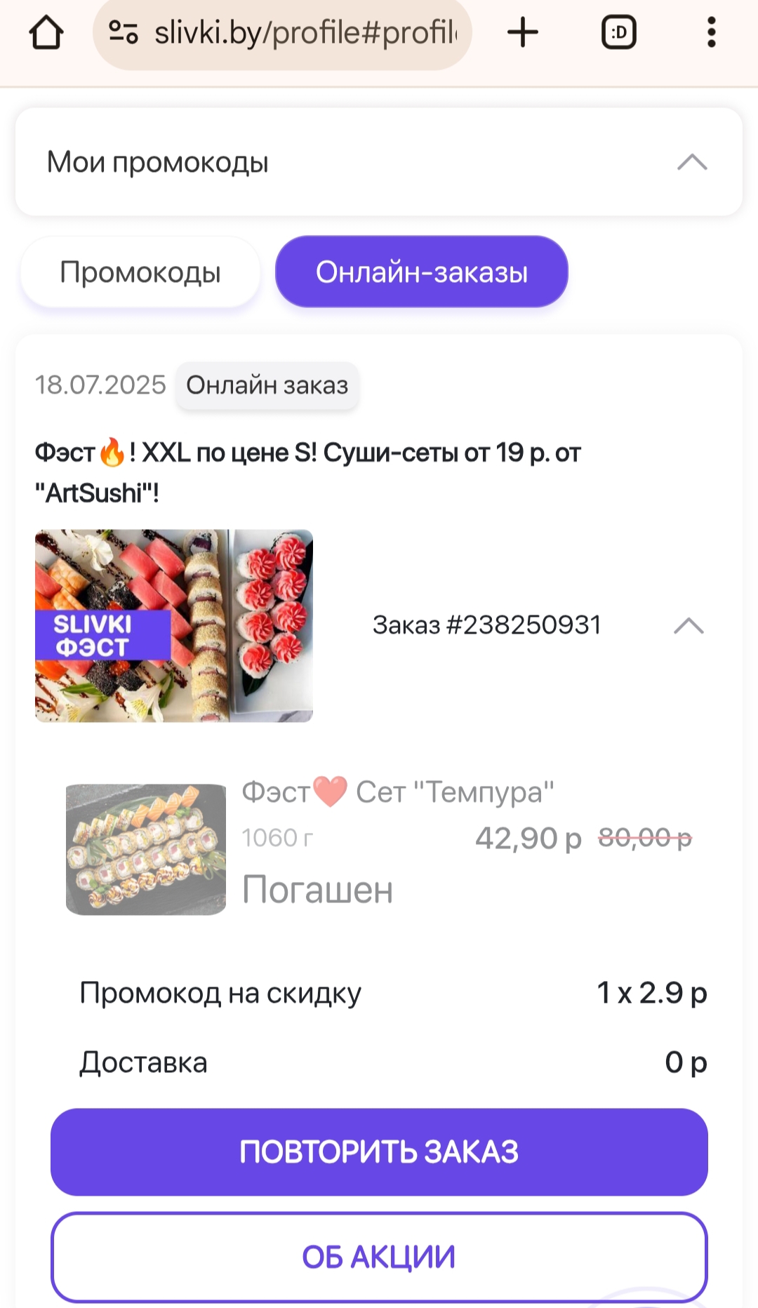 - Промокод дает право на скидку до 62% на суши-сеты от "ArtSushi"
