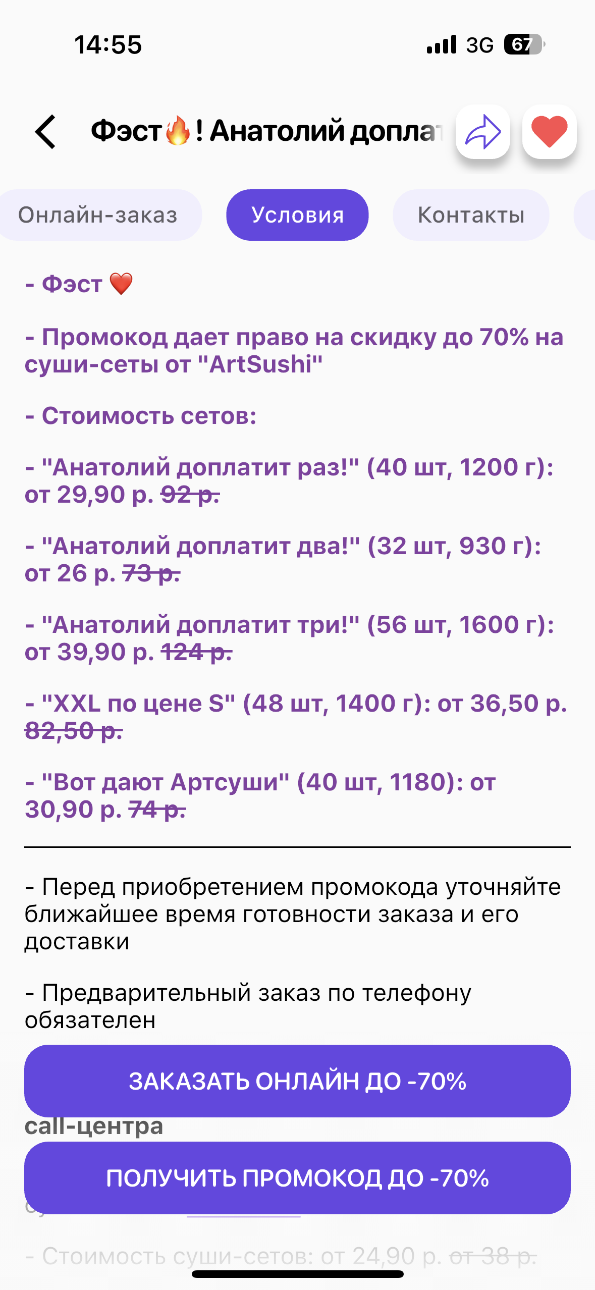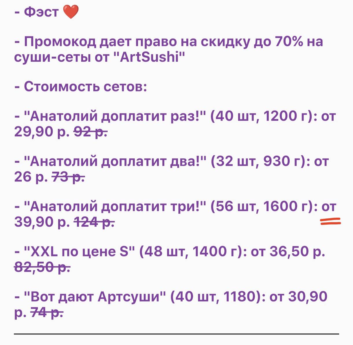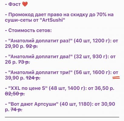 - Промокод дает право на скидку до 67% на суши-сеты от "ArtSushi"