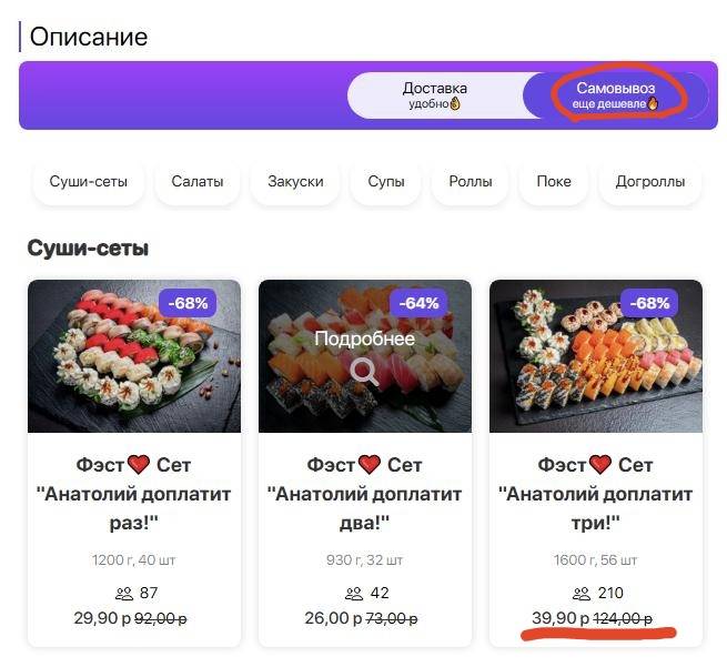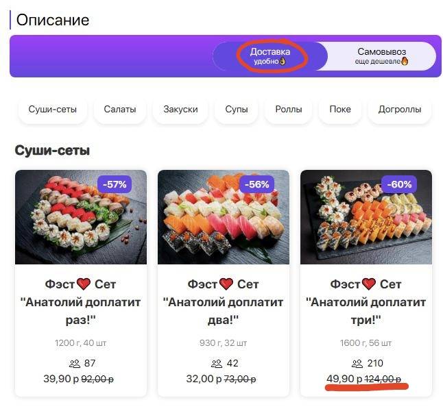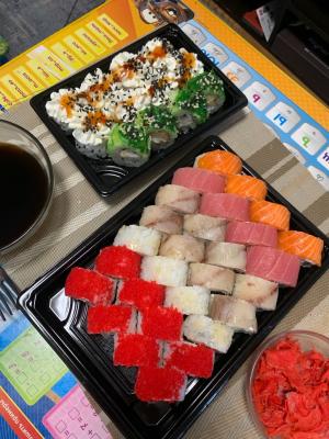 - Стоимость суши-сетов: от 32,90 р. от 58 р.
