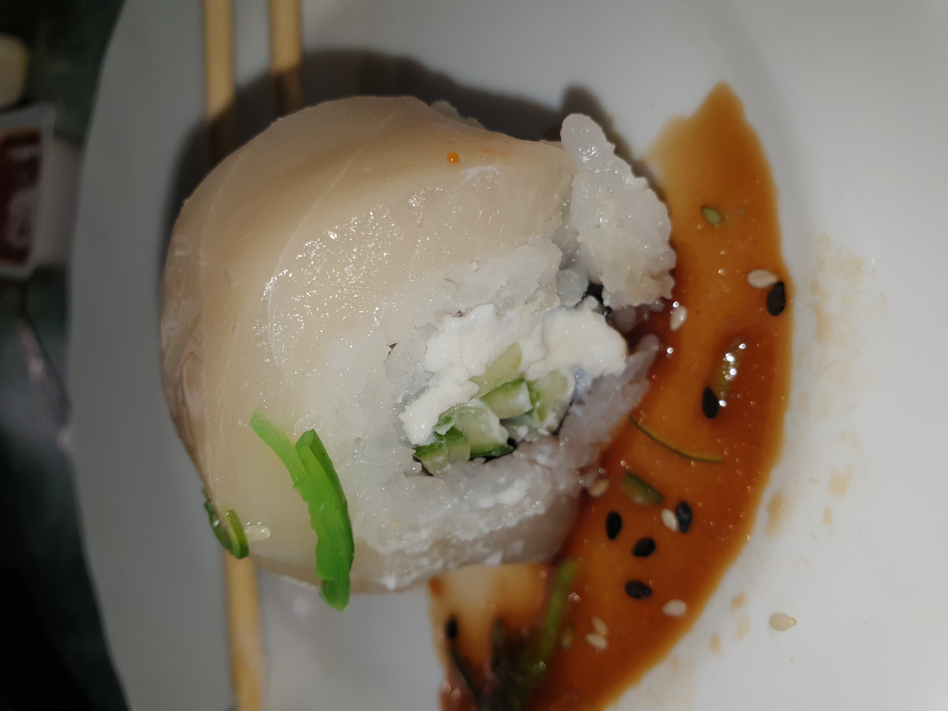- ролл "Мидии терияки под сырной шапочкой": мидии, морковь терияки, кунжут, крем-сыр, соус терияки, нори, рис - 8 шт.