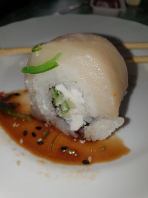 - ролл "Крем-шитаке в японском блинчике": грибы шиитаке, обжаренные в соусе терияки, крем-чиз, японский блинчик оранж, такуан, соус терияки, арахис, нори, рис - 8 шт.