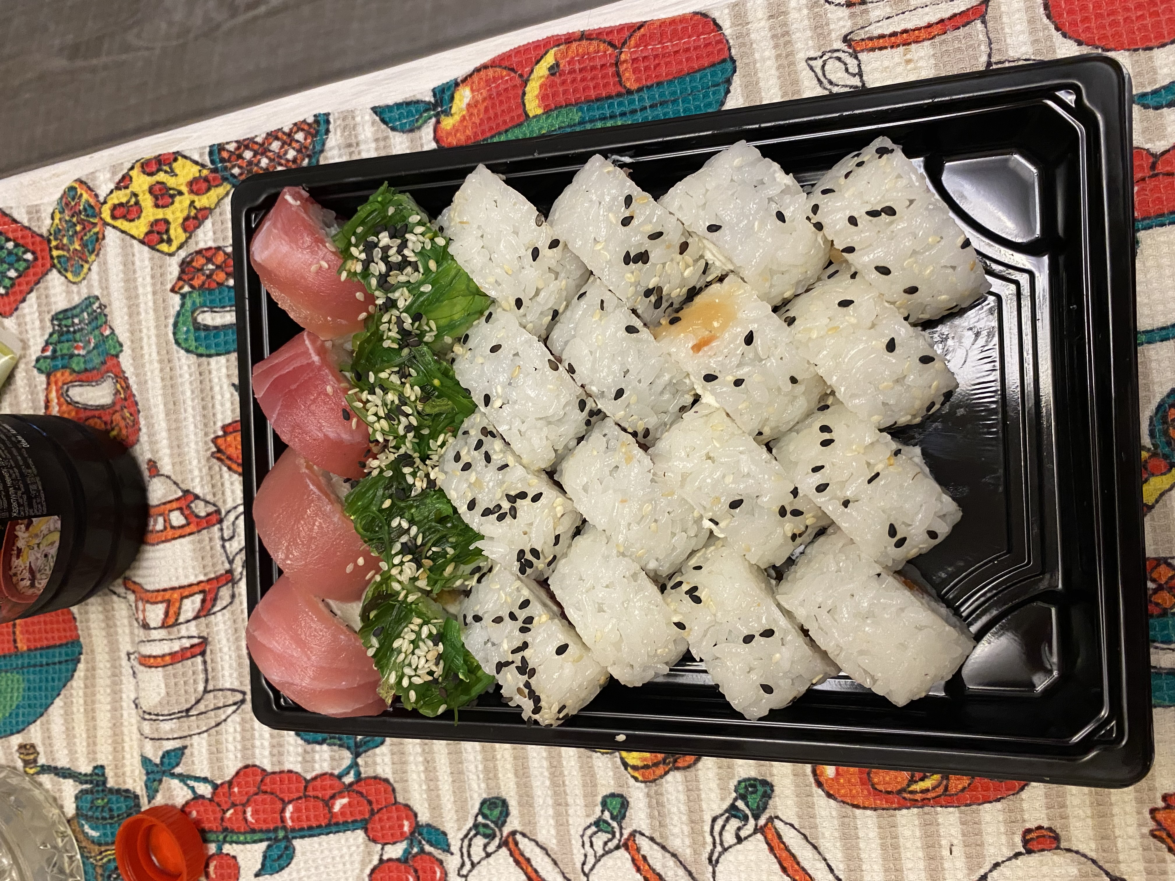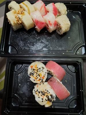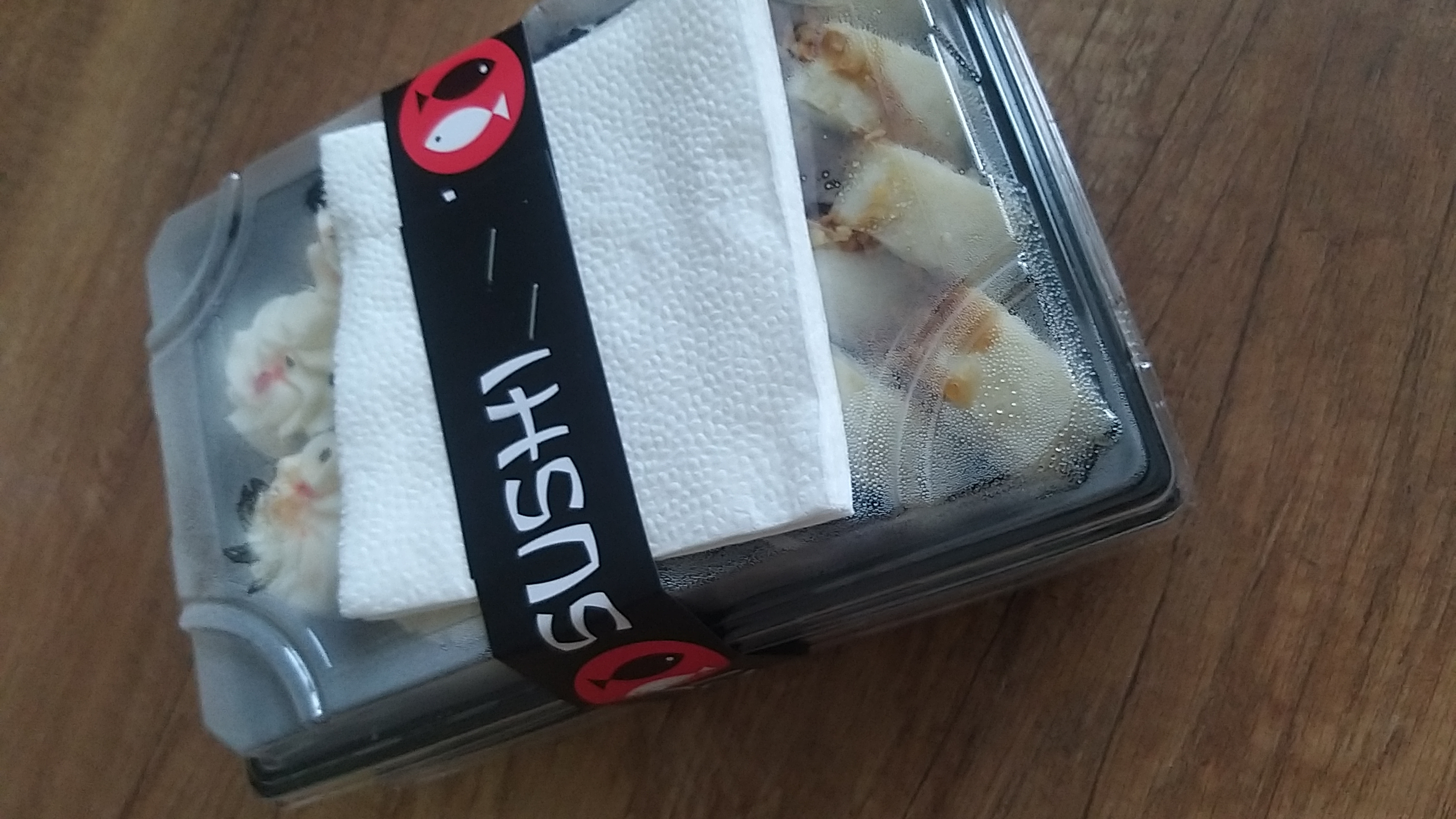 Заказывали суши сегодня, в принципе суши неплохие, вкусные, но минус бал за внешний вид, т.к. на картинке выглядели по-другому. Сет «Таити».