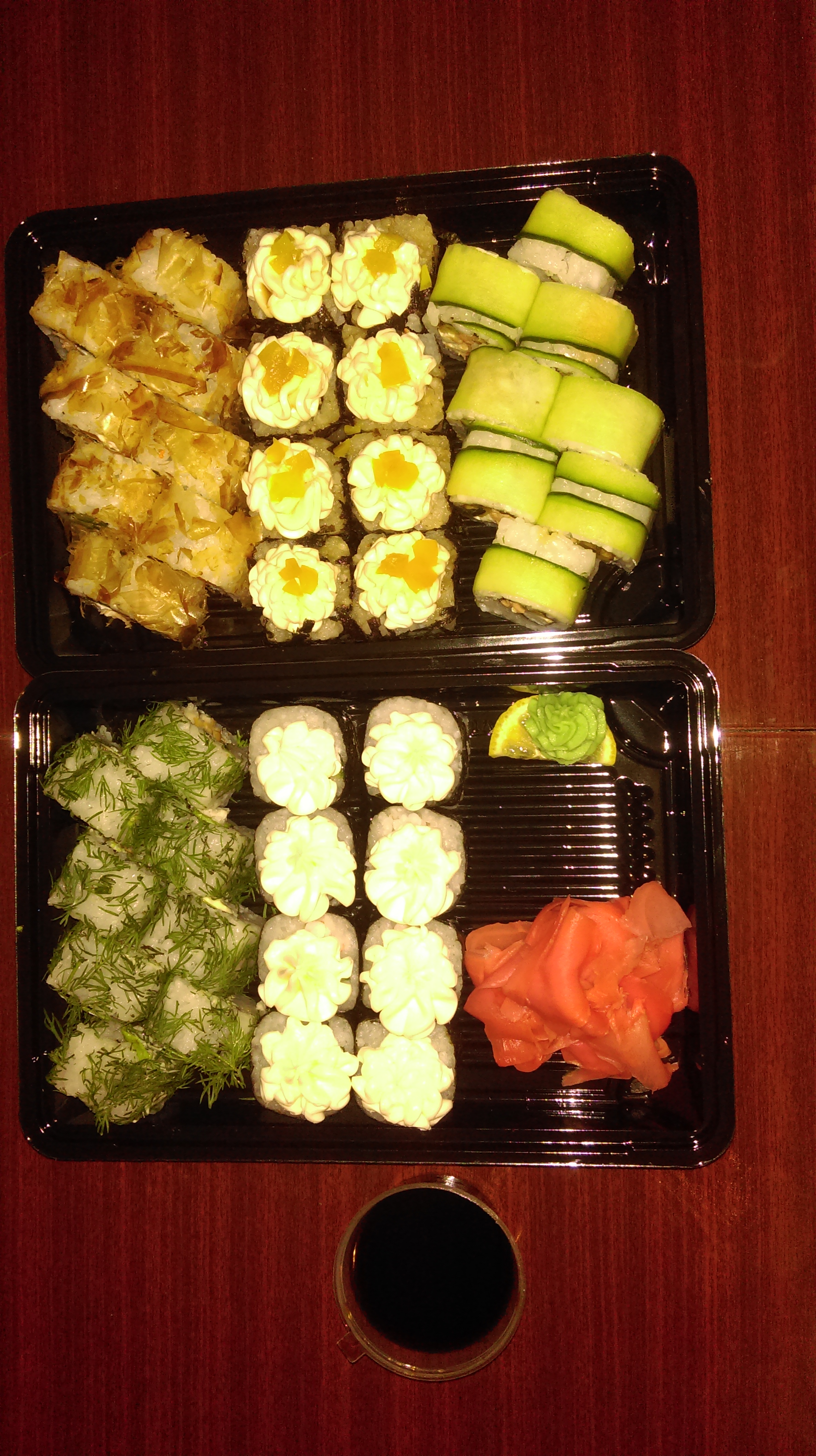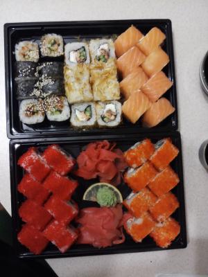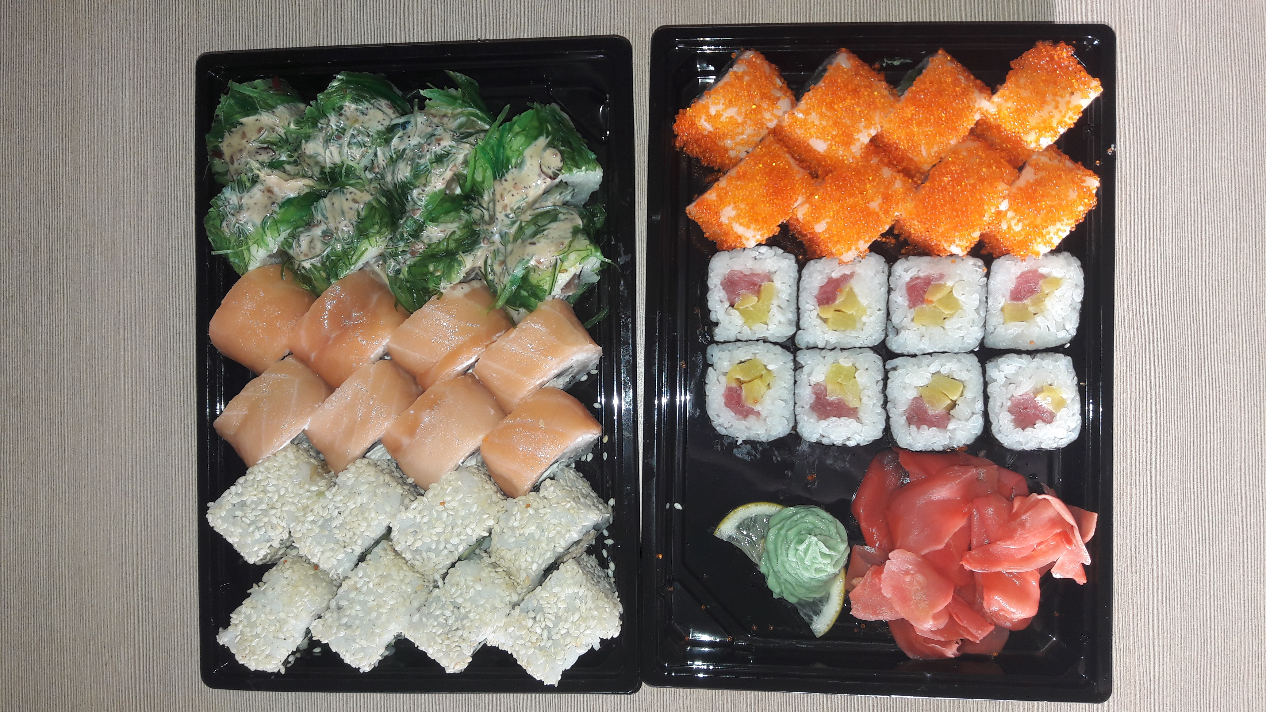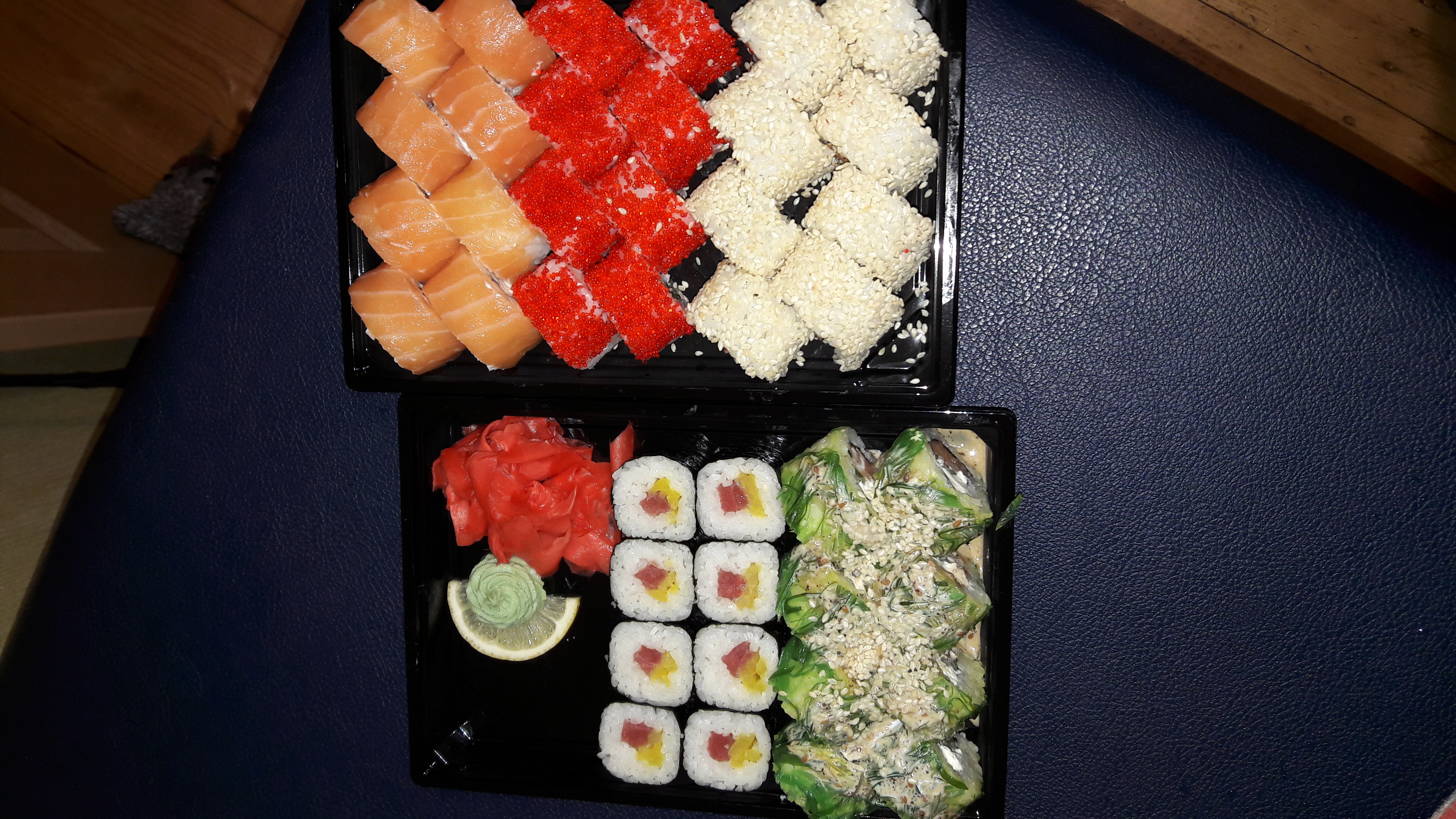 Заказала с подружками - не пожалели) Заказали Сет "Брюгге". Суши вкусные, не разваливаются! В подарок соевый соус, имбирь (на любителя) и васаби) Привезли в течении 2х часов. Очень довольны - спасибо большое:)