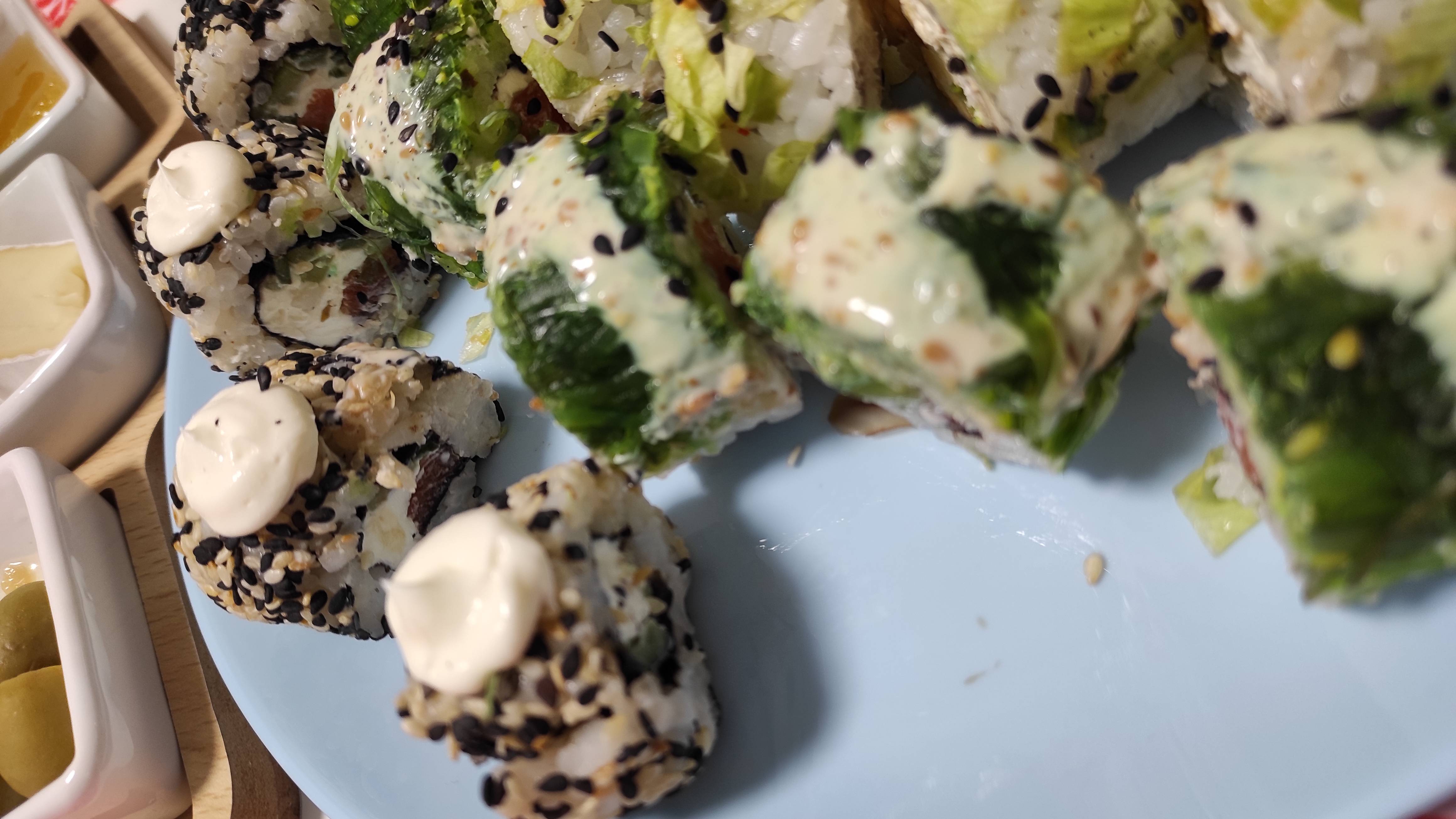 Заказали сет бусидо + вего роллы,пока самые вкусные вего роллы в моей жизни,попросили что-бы каробочку с вего роллами отметили как-то,они нарисовала котика,это было очень мило,будем заказывать у вас ещё )