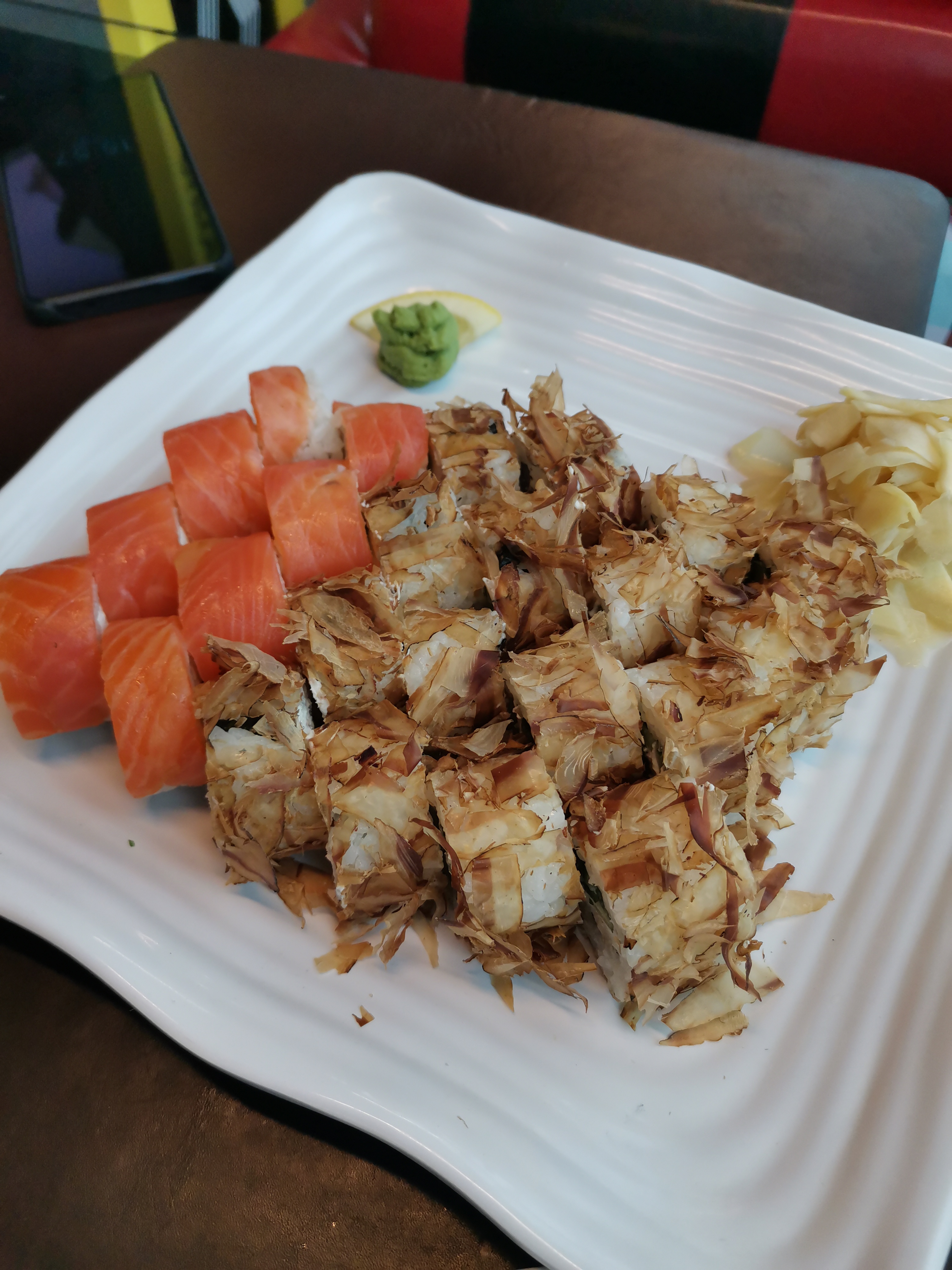 Состав: филе тунца, огурец, сливочный сыр, стружка тунца, рис, нори, соевый соус.