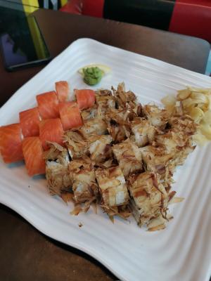 Состав: креветка в темпуре, тунец, сливочный сыр, авокадо, соус Тоби, рис, нори.