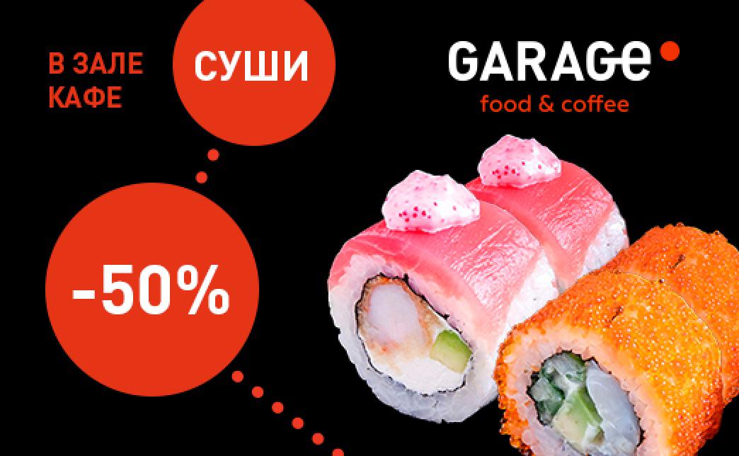 - Промокод дает право на скидку 50% на роллы в кафе "GARAGE"