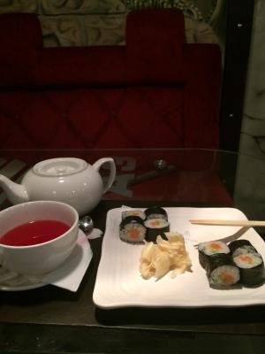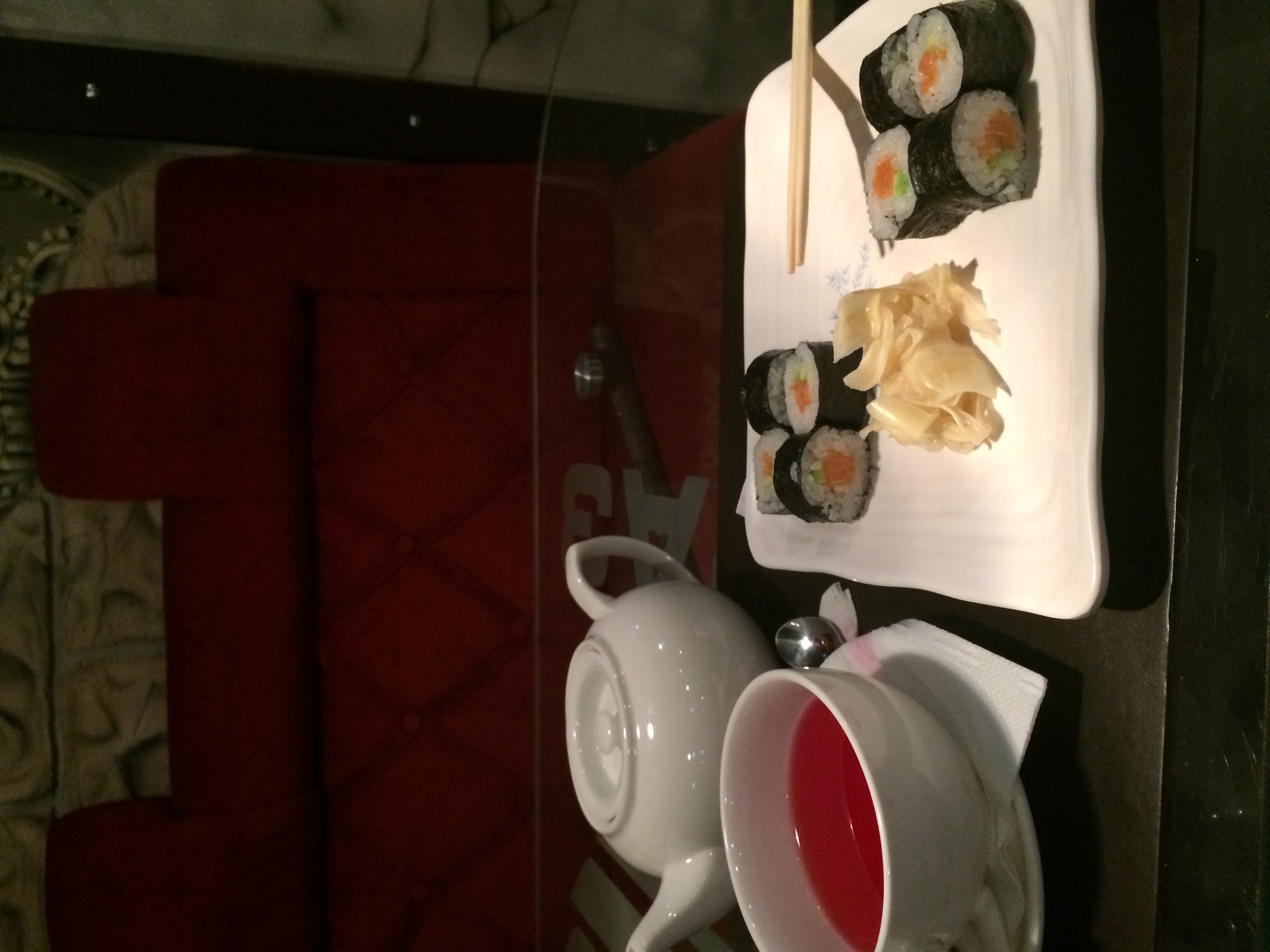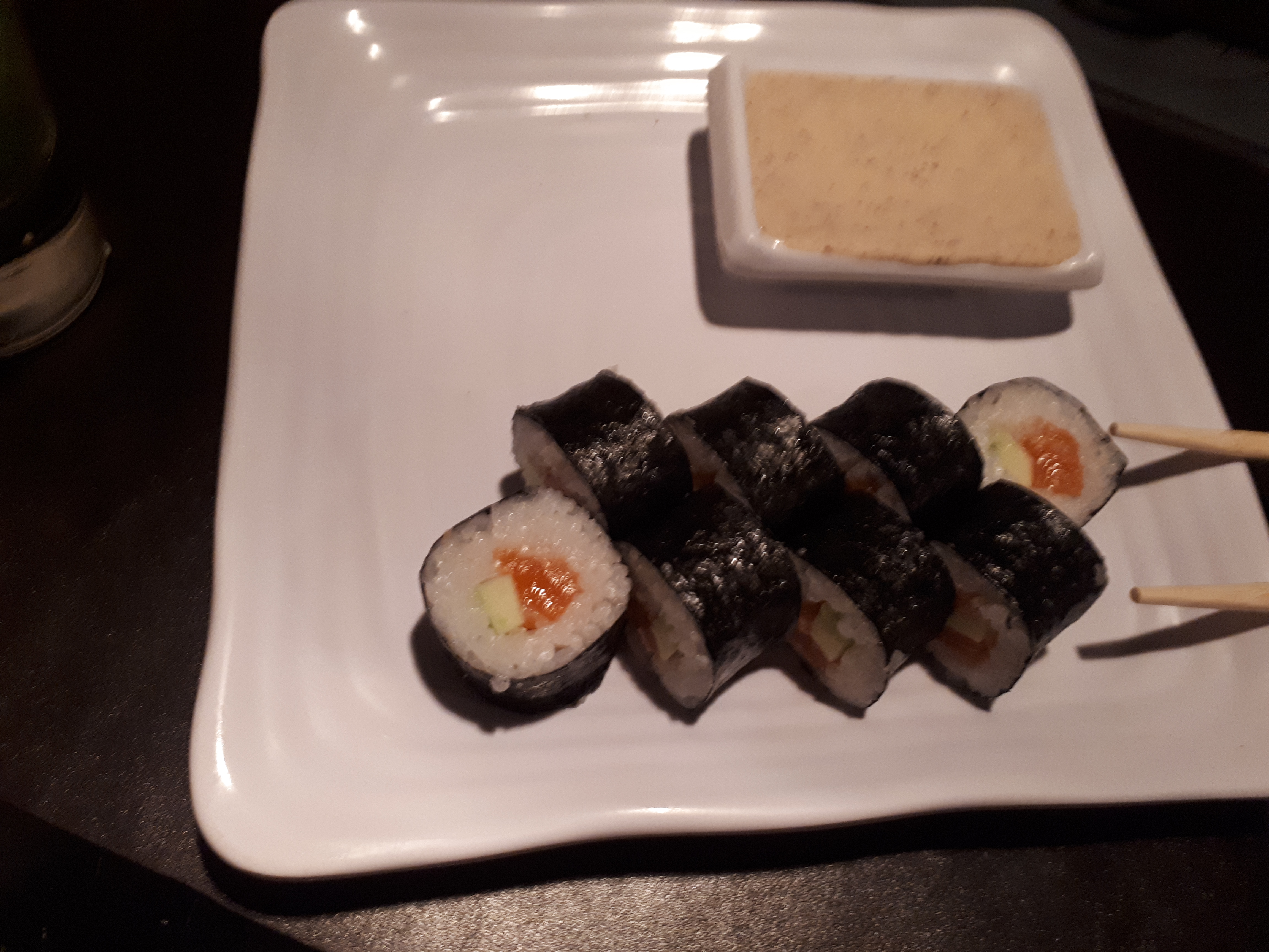 Состав: лосось, чука салат, сливочный сыр, ореховый соус, рис, нори.