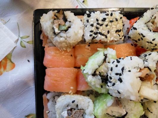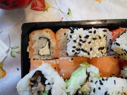 - Сезам (салат чука, сыр филадельфия, орехи кешью, кунжут, соус ореховый, соус унаги, рис, нори)