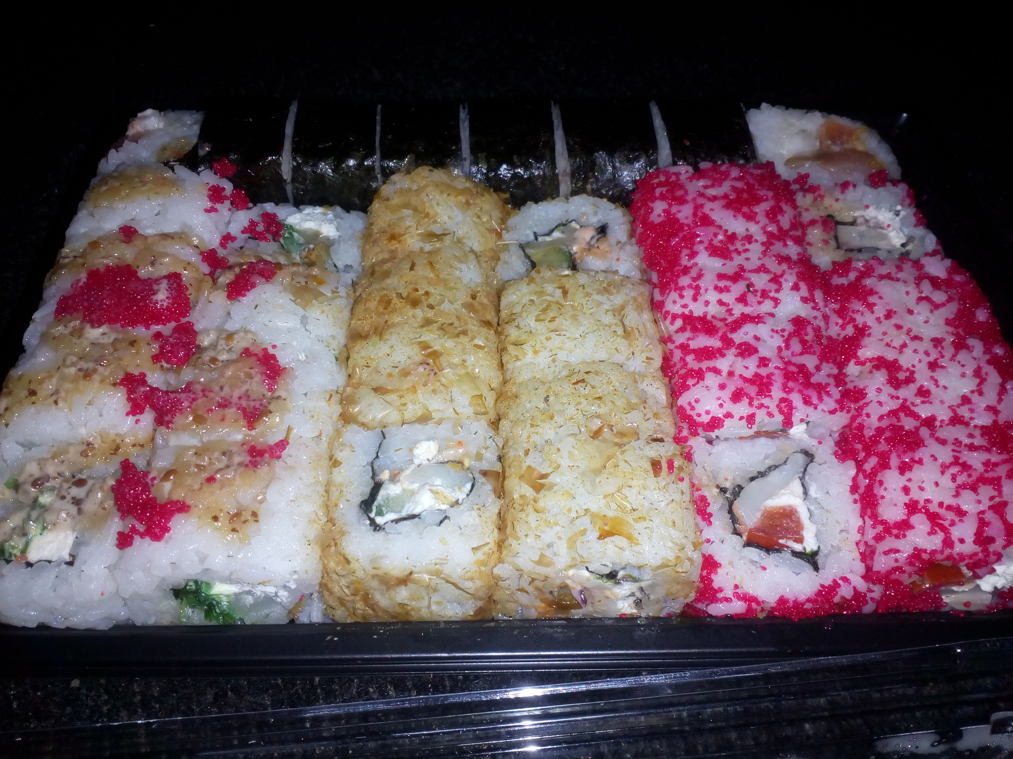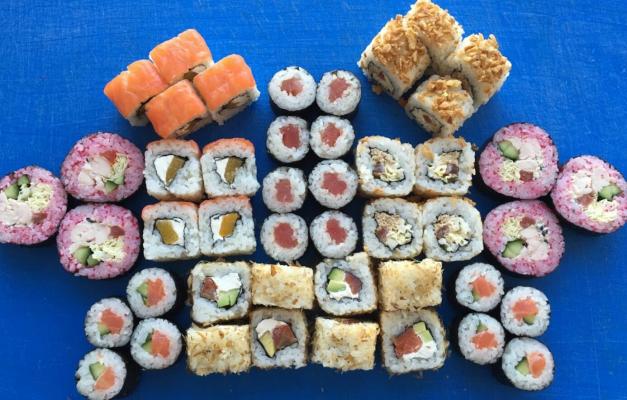 - Унаги тай (филе угря, маринованный окунь, авокадо, свежий огурец, сыр филадельфия, рис, нори)