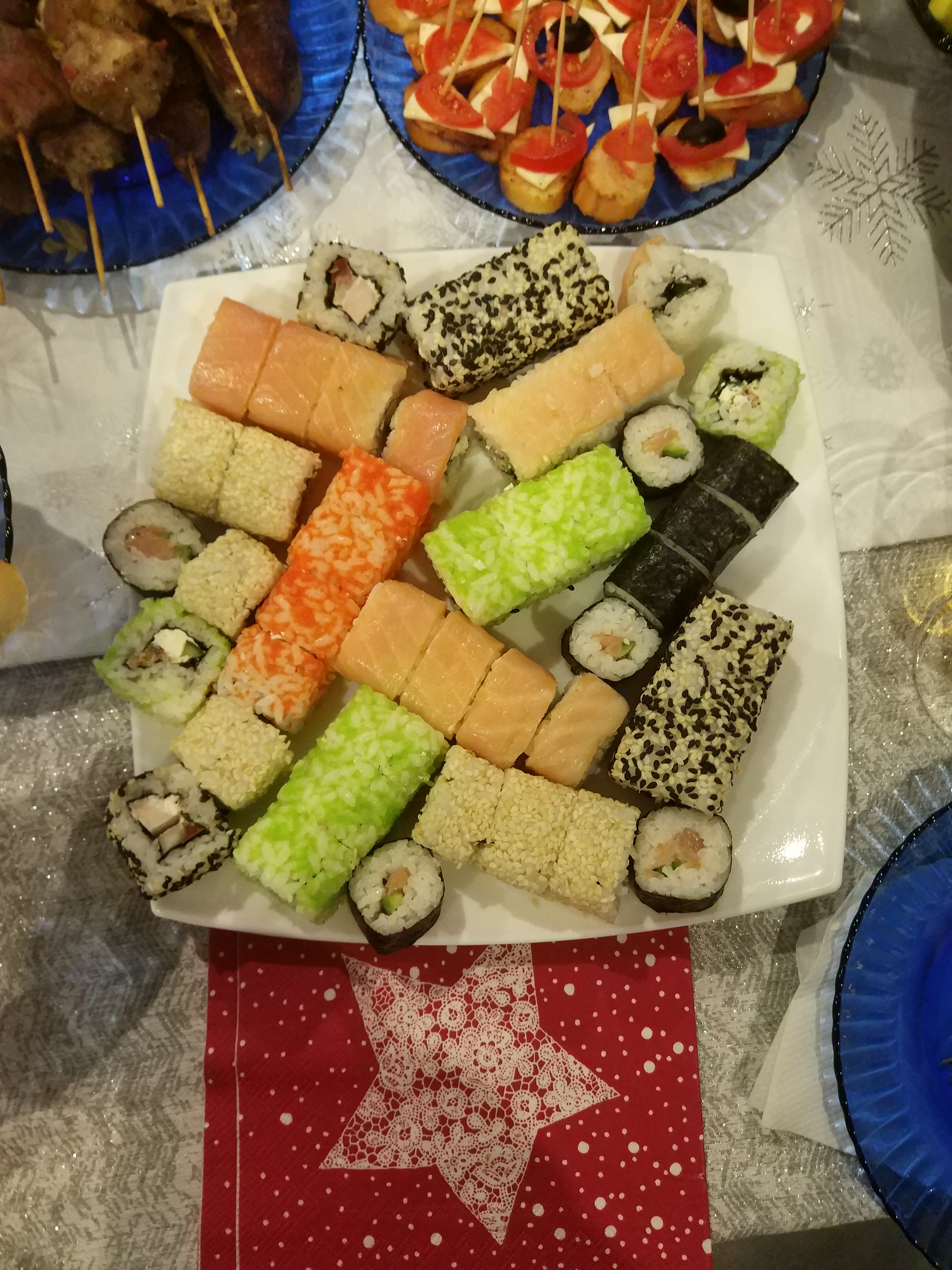 - Калифорния (креветки, авокадо, икра тобико, сыр филадельфия, кунжут, рис, нори)