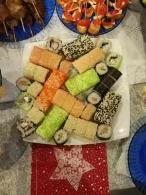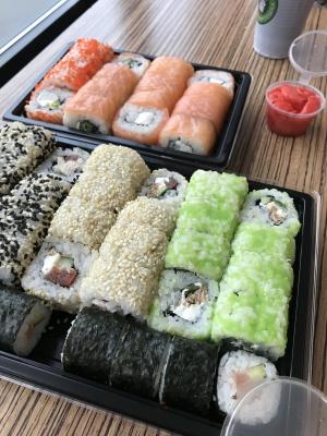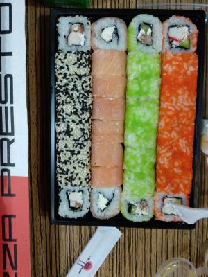 - Филадельфия Ясай (лосось, свежий огурец, сладкий перец, перья зеленого лука, сыр филадельфия, рис, нори)