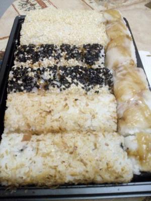 - Ролл с орехом кешью и бананом (банан, орех кешью, сыр филадельфия, кунжут, соус терияки, рис, нори)