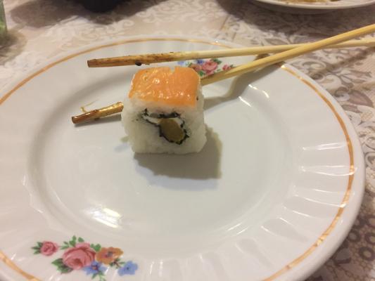 - Мини ролл с окунем (окунь маринованный, рис, нори)