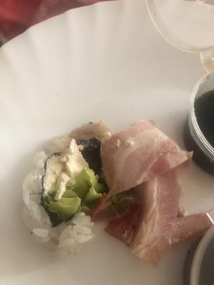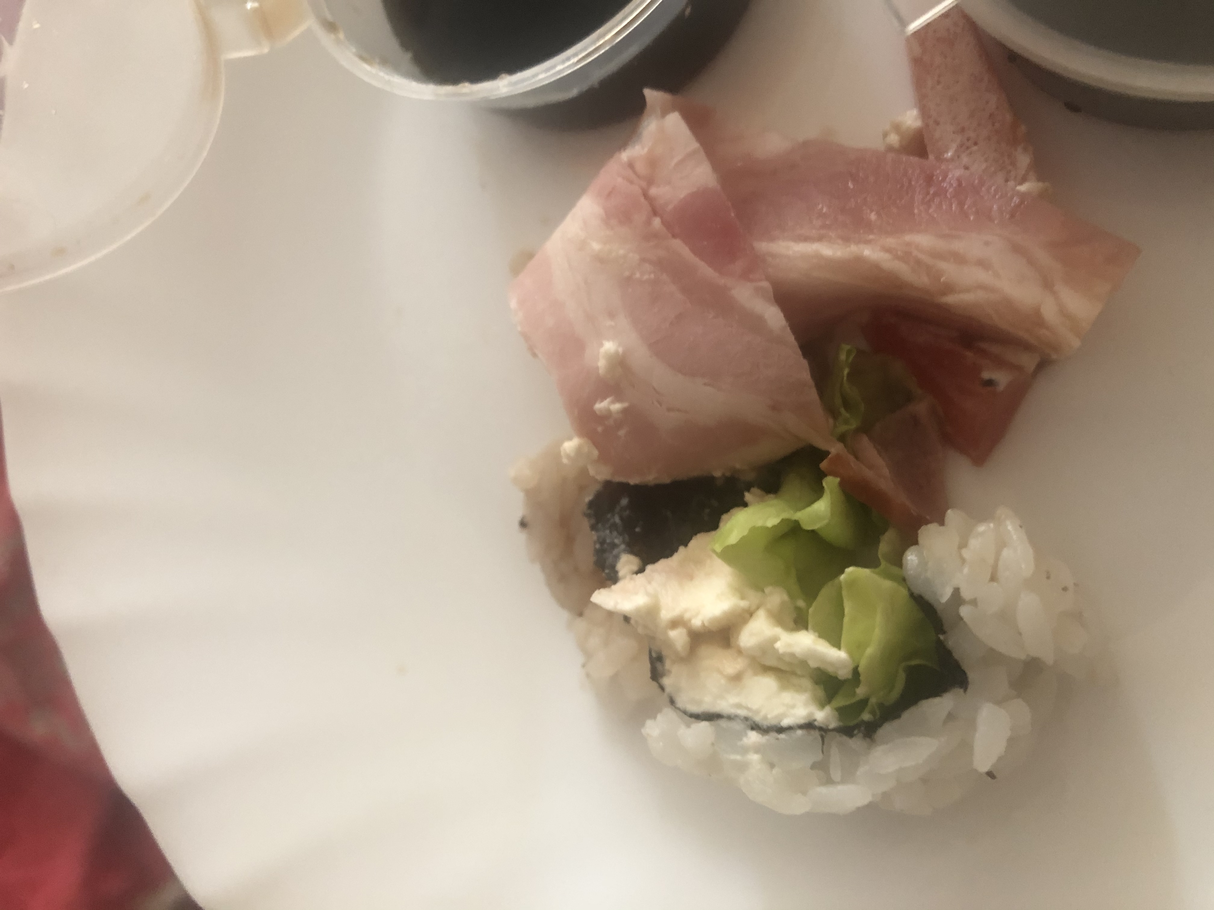 - сливочный сыр, бекон, помидор, салат айсберг, рис, нори (4 шт)