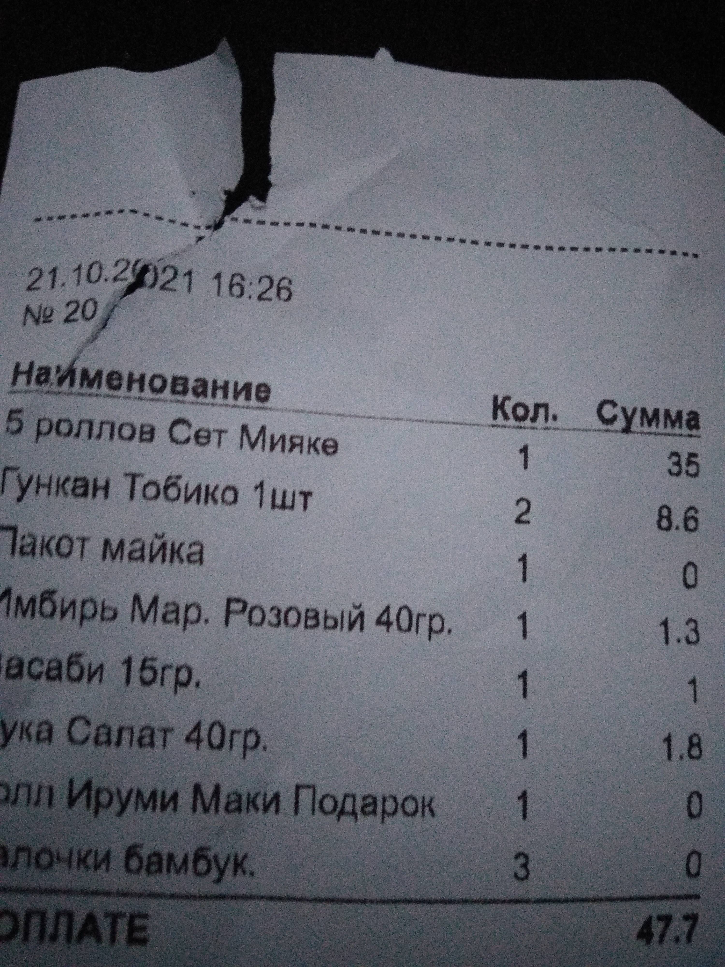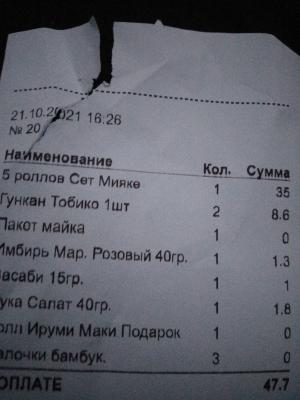 Заказывали сегодня сет «Мияке» . Суши получили очень свежие, вкусные. Рекомендую!!