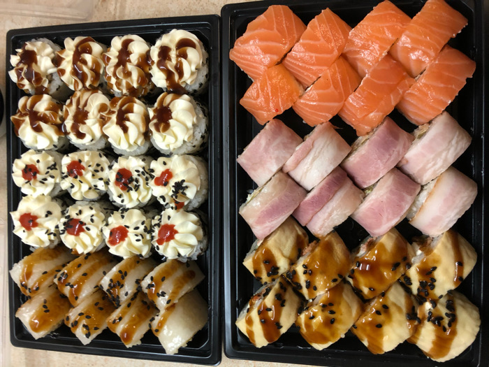 суши вкусные, начинки не жалеют. лосось нормальный. доставку заказали заранее, все привезли вовремя