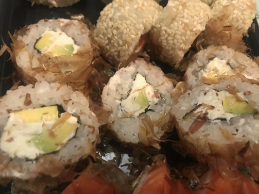 - сливочный сыр, филе лосося, авокадо, стружка тунца, рис, нори (8 шт)